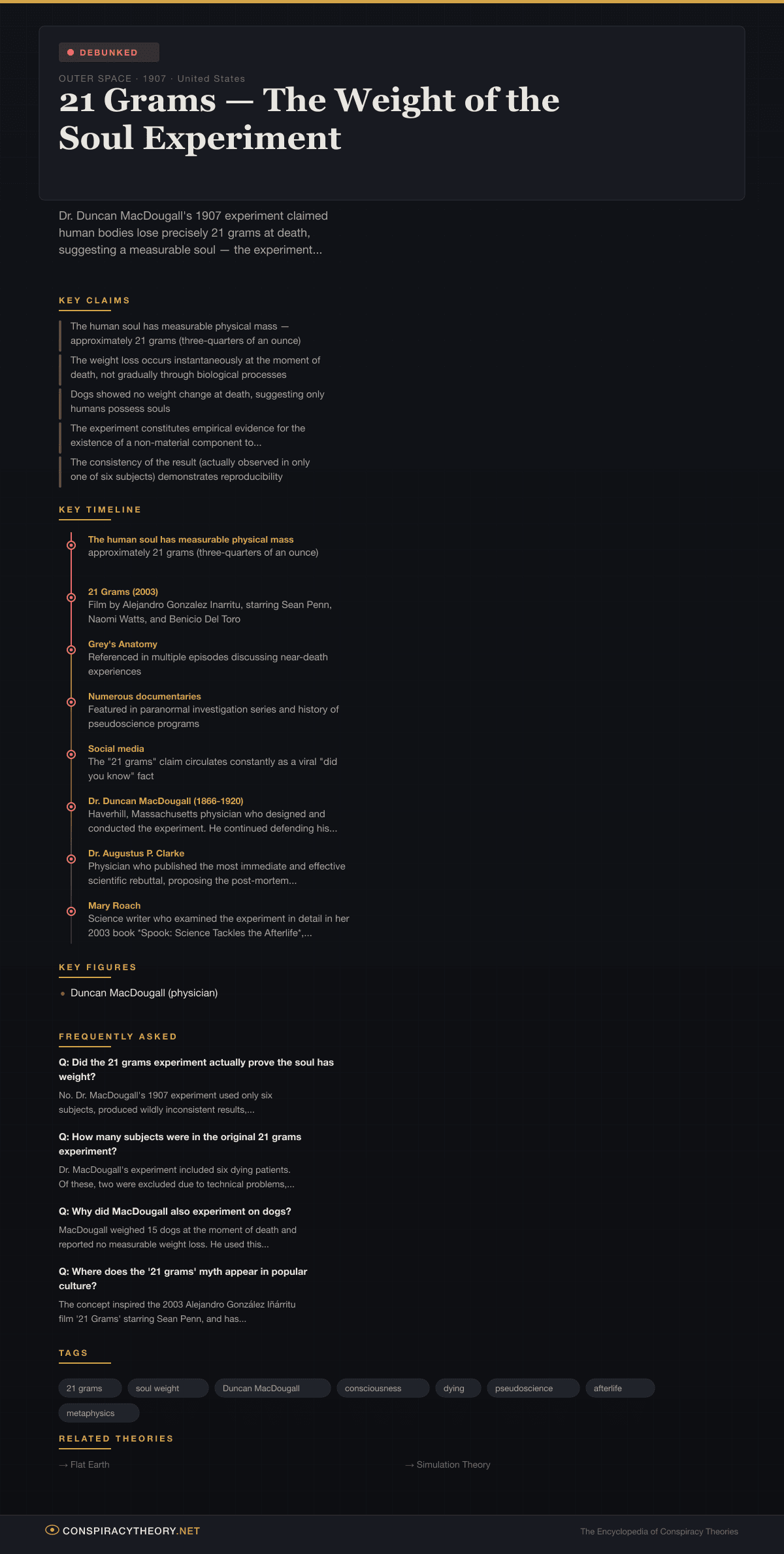 More than a century later, “21 grams” endures as one of the most persistent pieces of pseudoscientific folklore in Western culture — a number that feels precise enough to be scientific and poetic enough to be meaningful. It is a case study in how a single bad experiment, amplified by a receptive media, can take on a life of its own that no amount of debunking can extinguish.