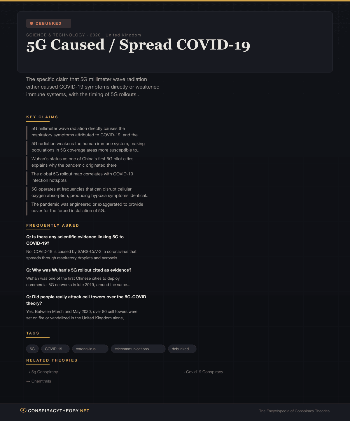 - 5G Conspiracy Theory — the broader anti-5G health claims from which the COVID-specific variant emerged