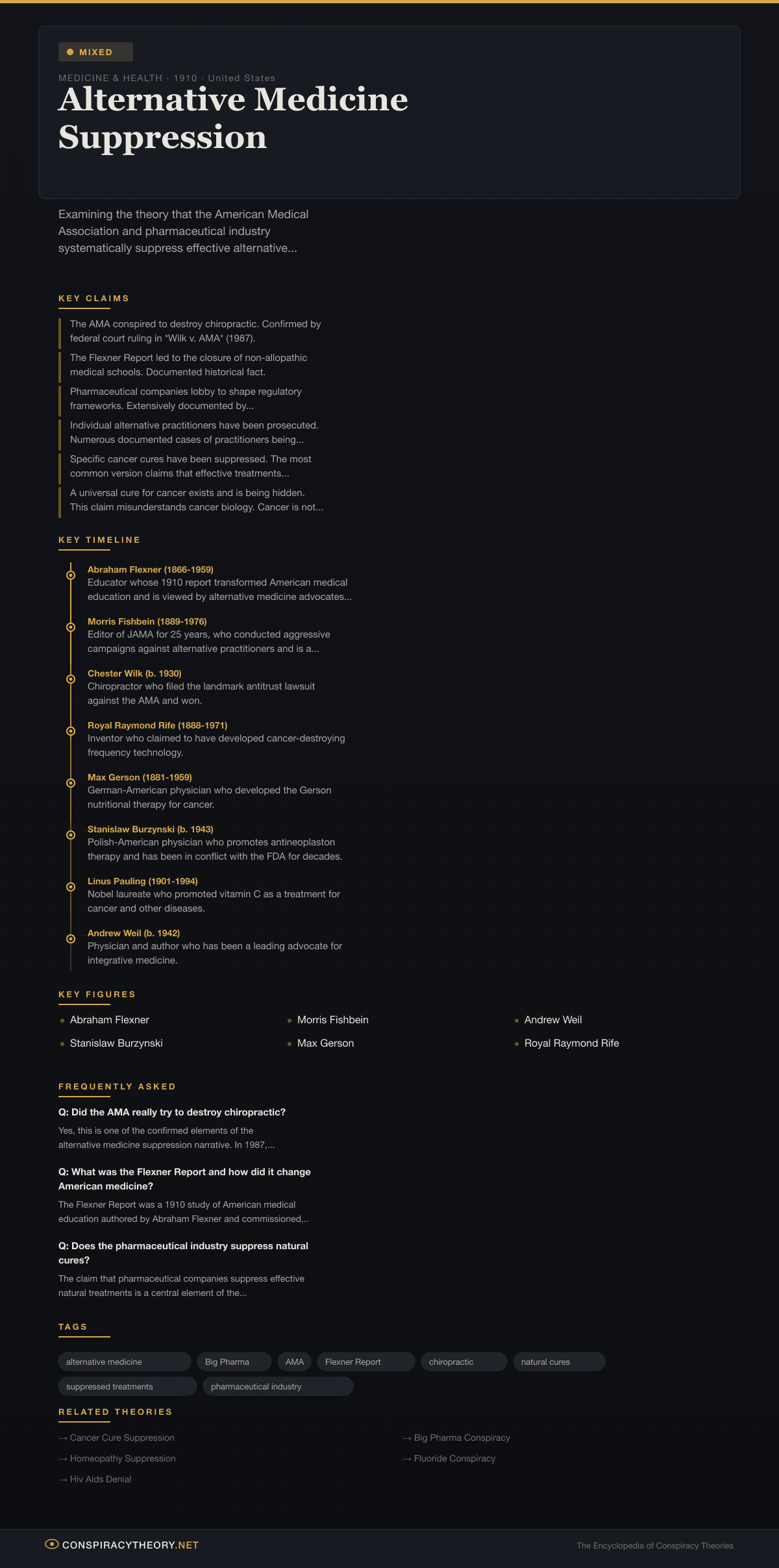 The theory is classified as mixed because it combines elements that are confirmed (the AMA’s anti-chiropractic campaign, pharmaceutical industry lobbying, institutional bias against non-mainstream approaches) with elements that are unproven or debunked (claims about specific suppressed cures, devices, and treatments that lack rigorous scientific evidence of efficacy). The challenge in evaluating this theory lies in separating legitimate critiques of institutional behavior from the unfounded extension of those critiques into claims that effective treatments are being hidden from the public.
