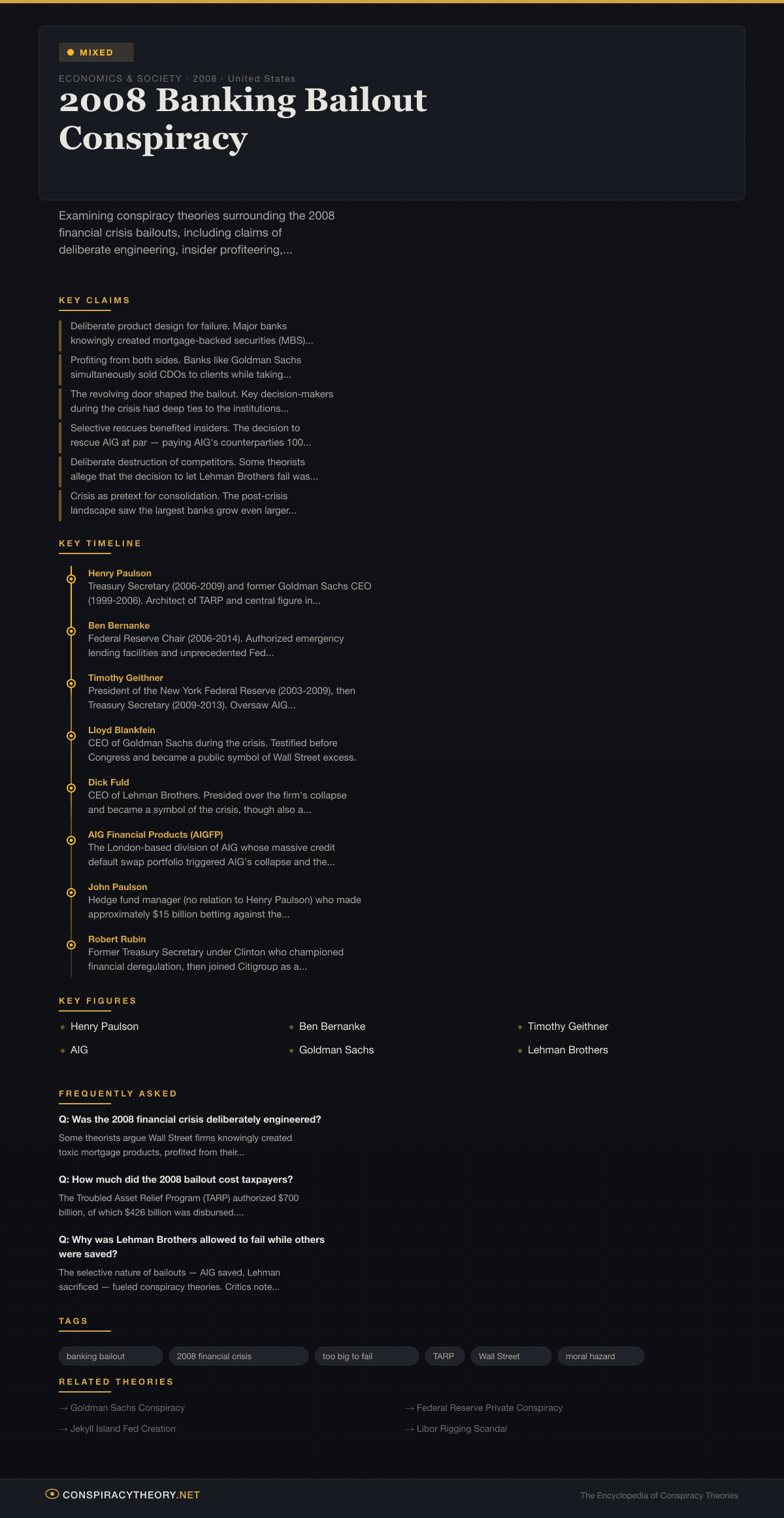 The 2008 Banking Bailout Conspiracy encompasses a family of theories alleging that the global financial crisis of 2007-2008 was not merely the result of systemic risk and regulatory failure, but was in part deliberately engineered or knowingly exploited by powerful financial institutions and their allies in government. Central to these theories is the claim that Wall Street banks created financial instruments they knew would fail, profited from the collapse through side bets, and then used their political connections to secure hundreds of billions of dollars in taxpayer-funded bailouts — while ordinary homeowners were left to bear catastrophic losses.