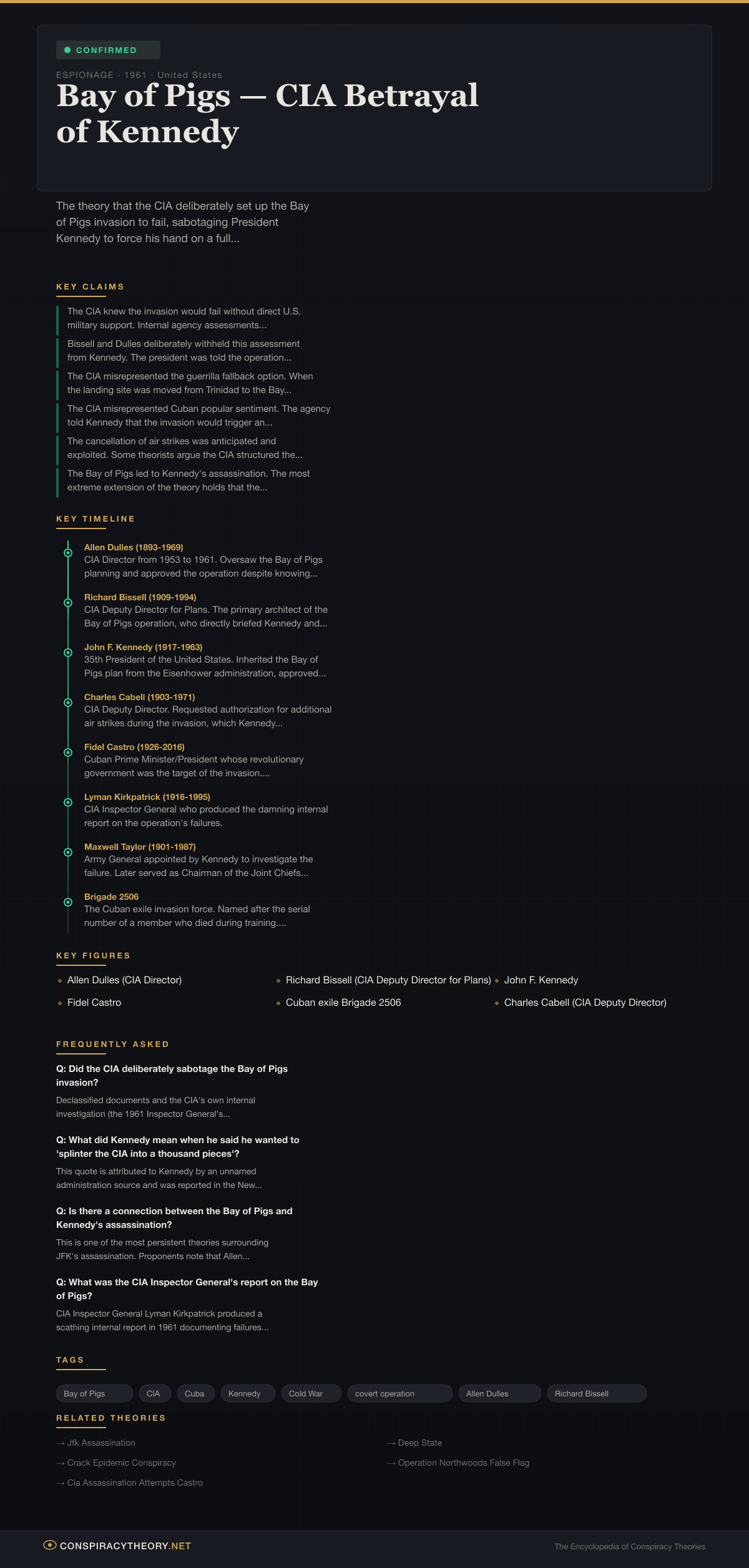 The core claim — that the CIA withheld critical intelligence from President Kennedy and misrepresented the operation’s chances of success — has been verified by the CIA’s own Inspector General report, the Taylor Committee investigation, declassified CIA cables and memoranda, and the personal testimony of multiple participants.