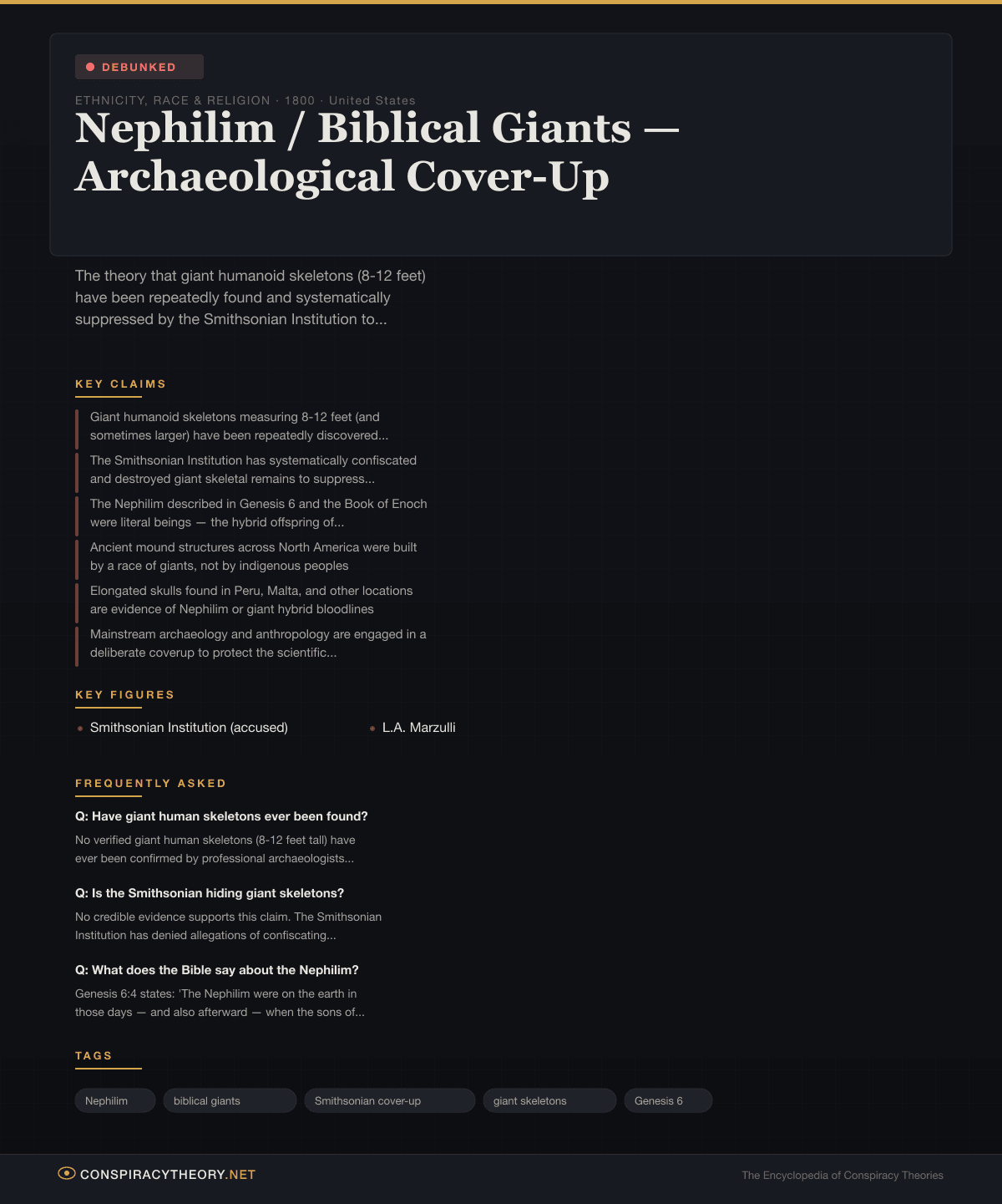 In 2014, a satirical article published by World News Daily Report claimed that a U.S. Supreme Court ruling had forced the Smithsonian to release classified documents admitting to the destruction of thousands of giant skeletons. The article was entirely fabricated, but it went viral on social media, and its claims continue to circulate as fact in Nephilim communities despite multiple debunkings.