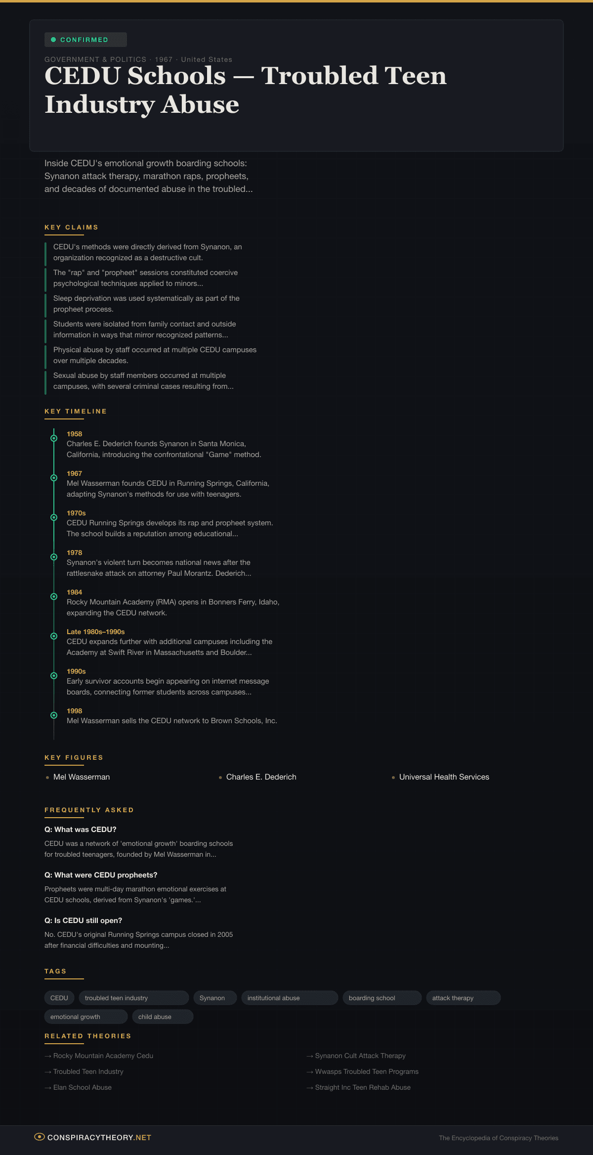 CEDU was a network of 'emotional growth' boarding schools for troubled teenagers, founded by Mel Wasserman in 1967 in Running Springs, California. The name derived from Charles E. Dederich, founder of the Synanon cult whose confrontational group therapy methods CEDU adopted. The schools used intensive group confrontation sessions called 'raps' and multi-day marathon emotional exercises called 'propheets' that involved sleep deprivation and extreme psychological pressure. Multiple CEDU campuses operated across the United States until abuse allegations, lawsuits, and investigations led to closures beginning in 2005.