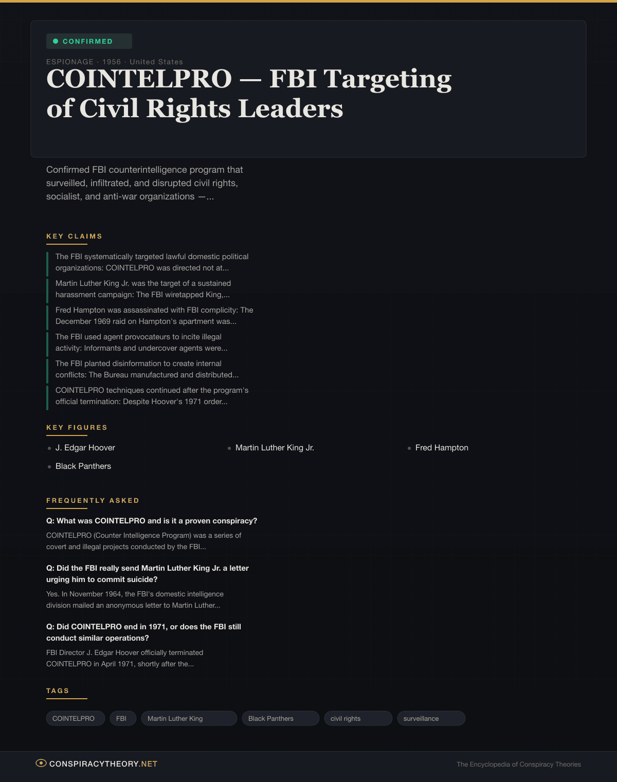 Confirmed FBI counterintelligence program that surveilled, infiltrated, and disrupted civil rights, socialist, and anti-war organizations — including harassment campaigns targeting MLK and organizing Fred Hampton’s assassination.