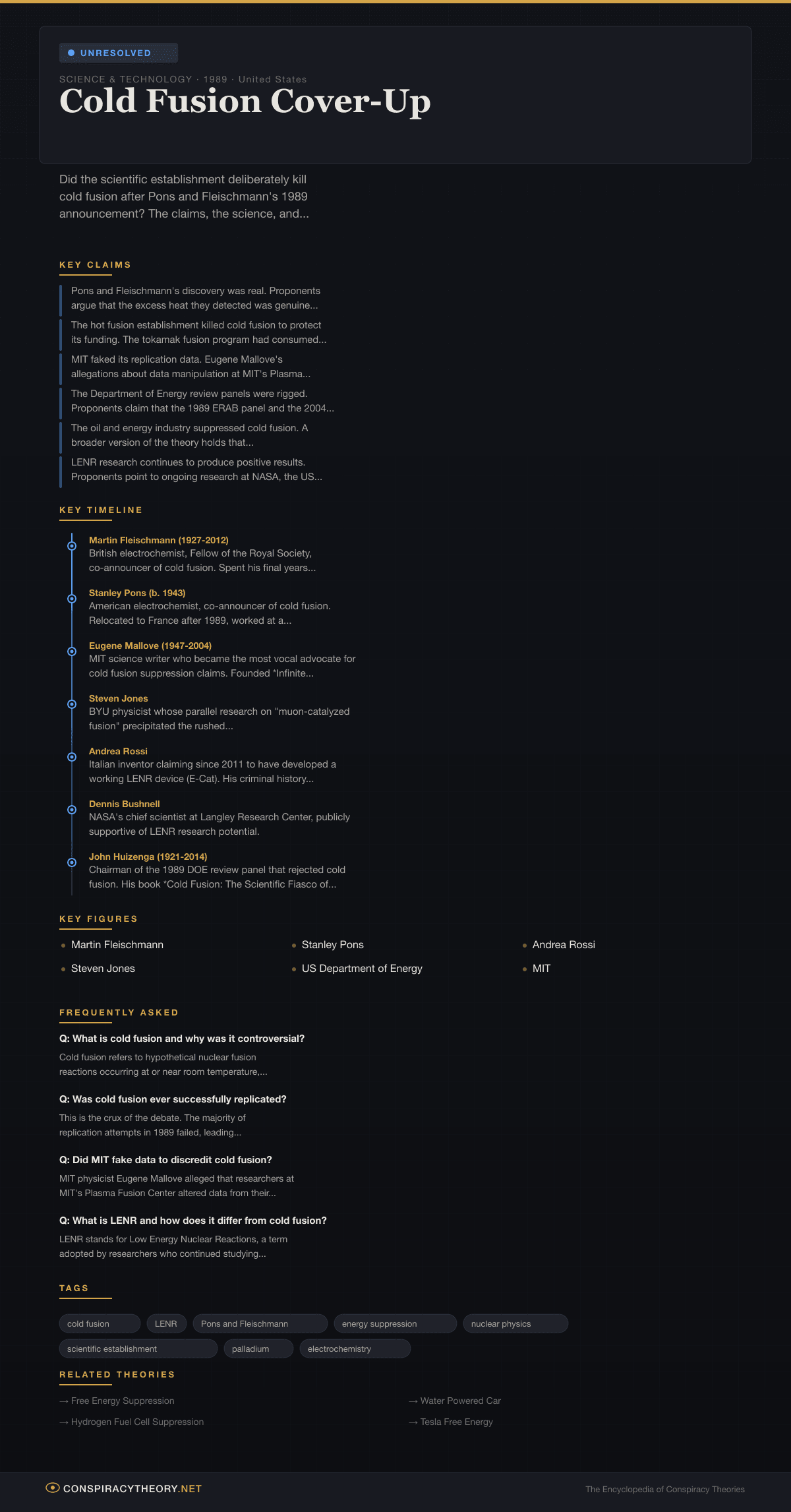 - Eugene Mallove (1947-2004) — MIT science writer who became the most vocal advocate for cold fusion suppression claims. Founded Infinite Energy magazine. Murdered in 2004 in circumstances unrelated to his advocacy.