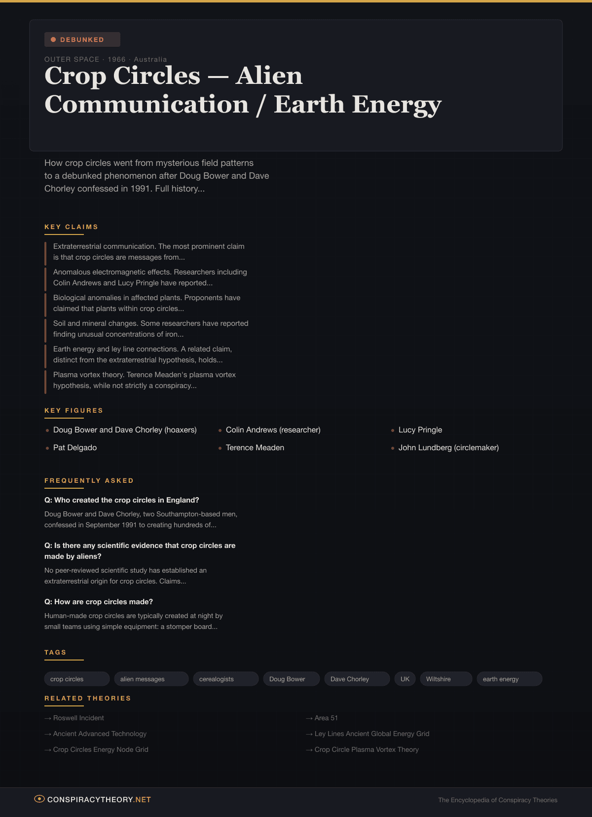 The alien communication hypothesis collapsed in September 1991, when Doug Bower and Dave Chorley, two men from Southampton, England, confessed to creating the vast majority of the formations that had fueled the phenomenon. They demonstrated their methods for journalists and researchers, showing how simple tools — planks of wood, rope, and a wire-fitted baseball cap — could produce the patterns that had baffled investigators for over a decade. Their confession did not end the appearance of crop circles; instead, it gave rise to an organized subculture of human “circlemakers” who have continued producing ever more elaborate designs, alongside a diminished but persistent community of believers who maintain that some formations cannot be explained by human activity alone. The theory’s status is classified as “debunked” because every crop circle whose origin has been definitively established was made by human beings, and no credible scientific evidence supports an extraterrestrial or paranormal explanation.