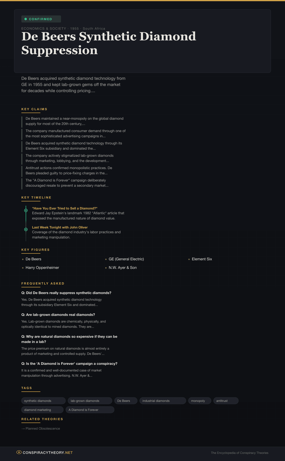| 1950s-1960s | De Beers establishes its own synthetic diamond operations (later Element Six) |