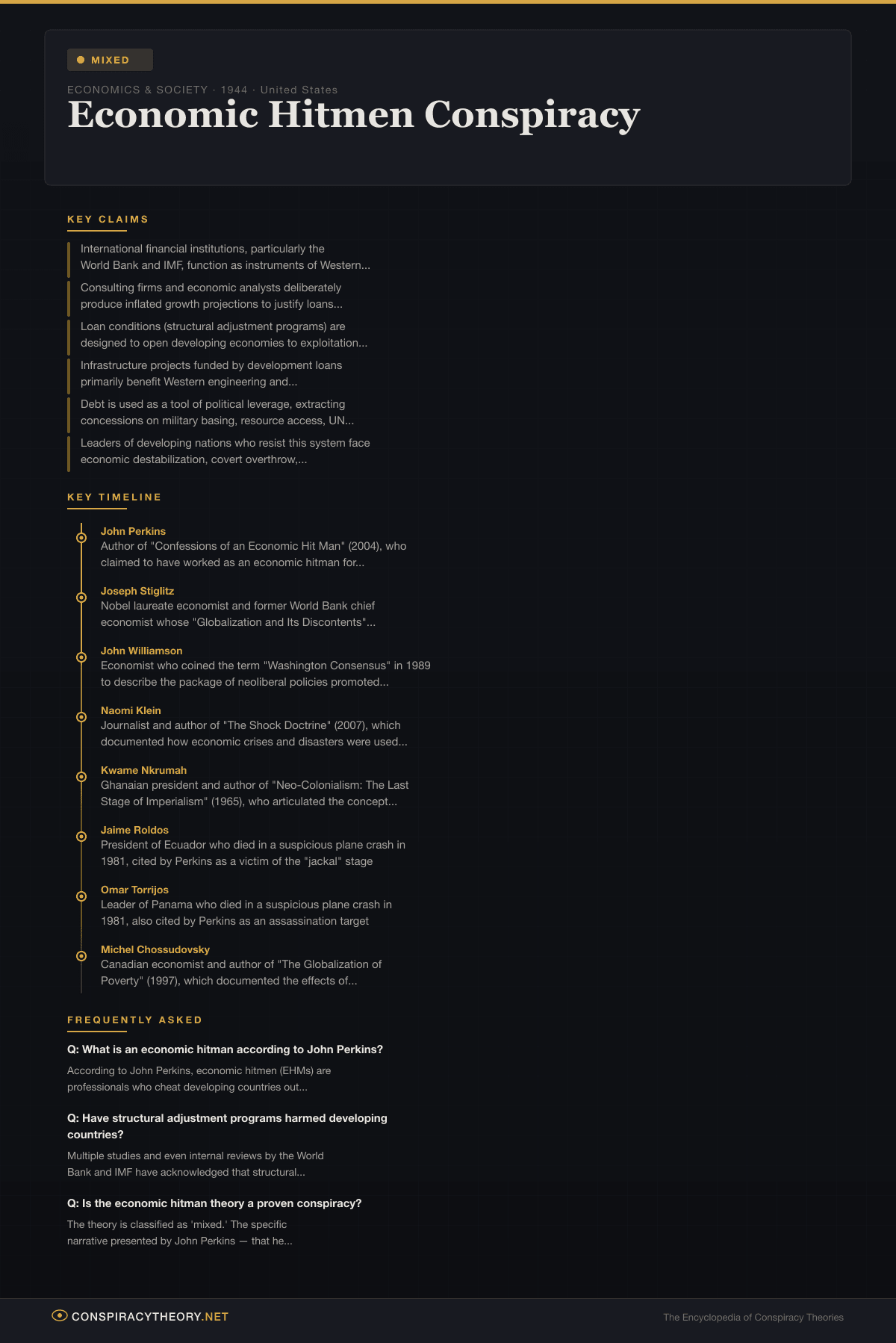 The theory is classified as “mixed” because while Perkins’ specific personal narrative has been questioned and some of his claims remain unverified, the broader pattern of economic coercion he describes is extensively documented by mainstream economists, historians, and even by former officials of the World Bank and IMF themselves. The mechanisms of structural adjustment, conditionality lending, and the geopolitics of debt are not in dispute — what is disputed is whether they represent a coordinated conspiracy or simply the predictable outcomes of institutional incentives and ideological orthodoxy.
