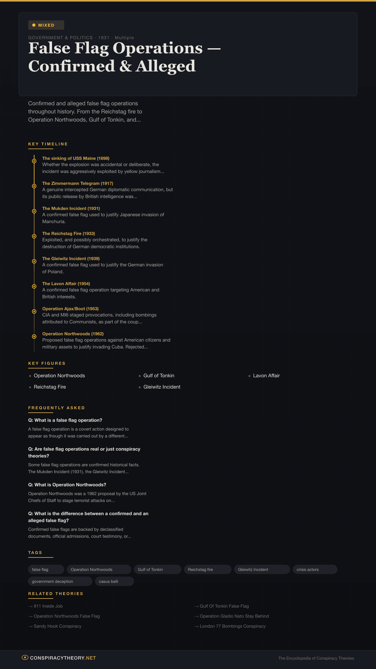This topic is classified as mixed because the concept is grounded in confirmed historical precedent, but the vast majority of modern false flag allegations — especially those involving domestic mass casualty events — remain unsupported by credible evidence.