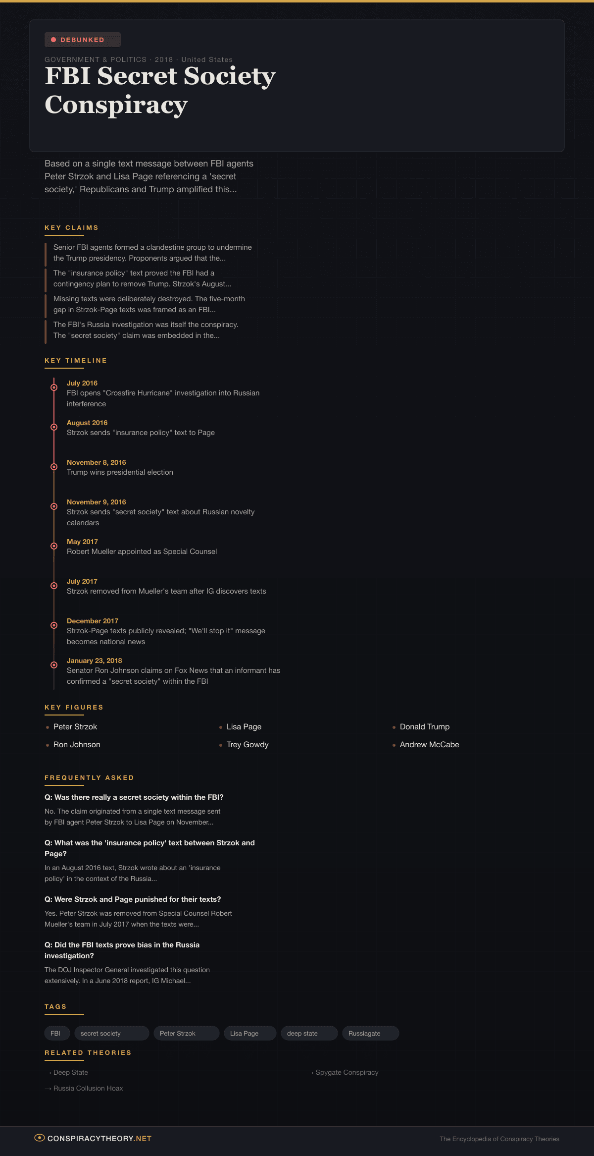 • The FBI’s Russia investigation was itself the conspiracy. The “secret society” claim was embedded in the broader theory — variously called Spygate or the “Russia hoax” — that the FBI, CIA, and Obama administration conspired to fabricate Russian collusion allegations against Trump.