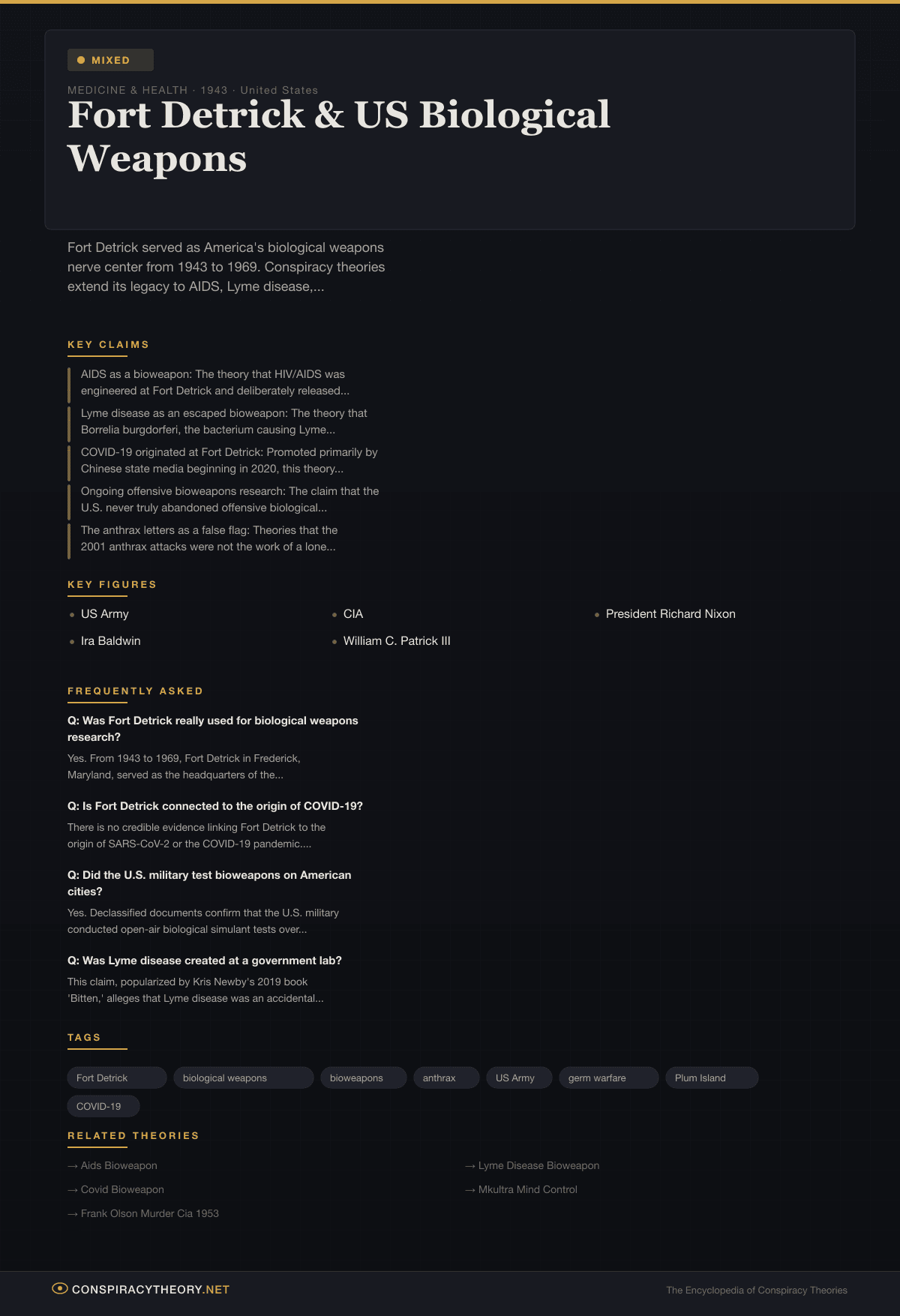 This article is classified as mixed because the core historical claims about Fort Detrick’s bioweapons program are thoroughly confirmed by declassified government documents, congressional testimony, and official acknowledgments. However, the extended theories linking Fort Detrick to specific modern diseases remain unproven, and in some cases have been actively debunked by the scientific community.