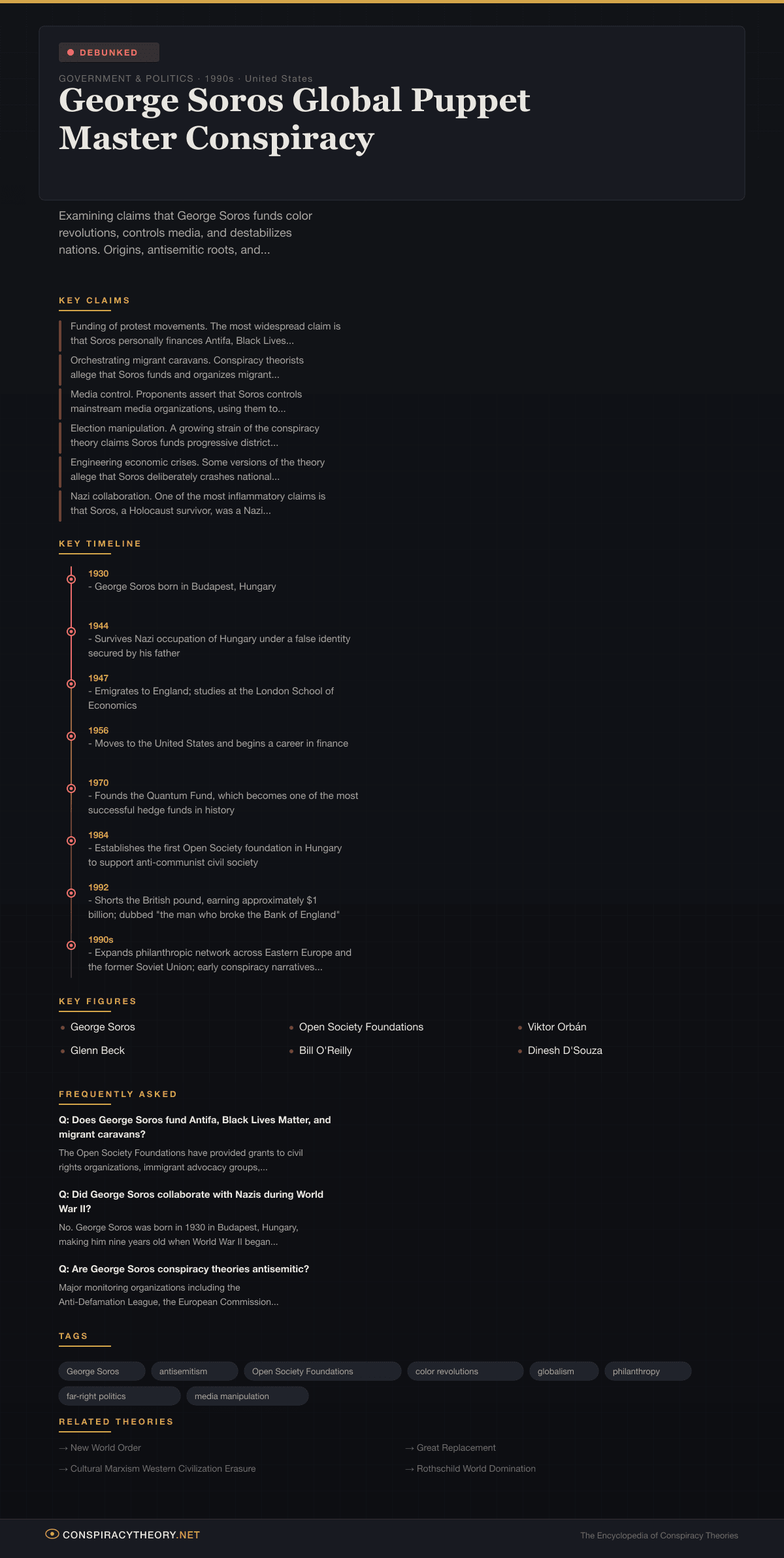 The George Soros conspiracy theory is a sprawling network of claims asserting that Hungarian-American billionaire investor and philanthropist George Soros secretly funds and orchestrates political unrest, social movements, media narratives, and regime changes around the world in pursuit of a globalist agenda. Specific allegations include that Soros finances Antifa, Black Lives Matter, migrant caravans, and so-called “color revolutions” in Eastern Europe and the former Soviet Union; that he controls mainstream media organizations; that the Open Society Foundations — his philanthropic network — functions as a front for political destabilization; and that his ultimate goal is the destruction of national sovereignty in favor of a borderless, centrally managed global order.