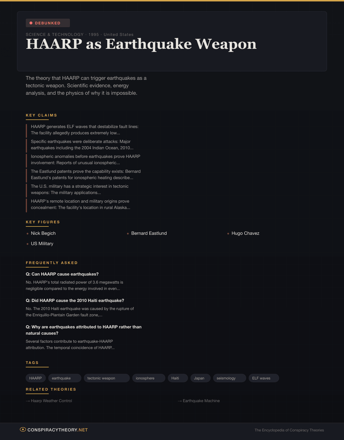 The HAARP earthquake weapon theory is a specific variant of the broader HAARP conspiracy that alleges the High-frequency Active Auroral Research Program — an ionospheric research facility in Gakona, Alaska — can be used to trigger earthquakes, volcanic eruptions, and tsunamis as a weapon of covert warfare. Proponents have attributed numerous major seismic events to HAARP, including the 2004 Indian Ocean earthquake and tsunami, the 2010 Haiti earthquake, the 2011 Tohoku earthquake and tsunami in Japan, and the 2023 Turkey-Syria earthquake sequence.