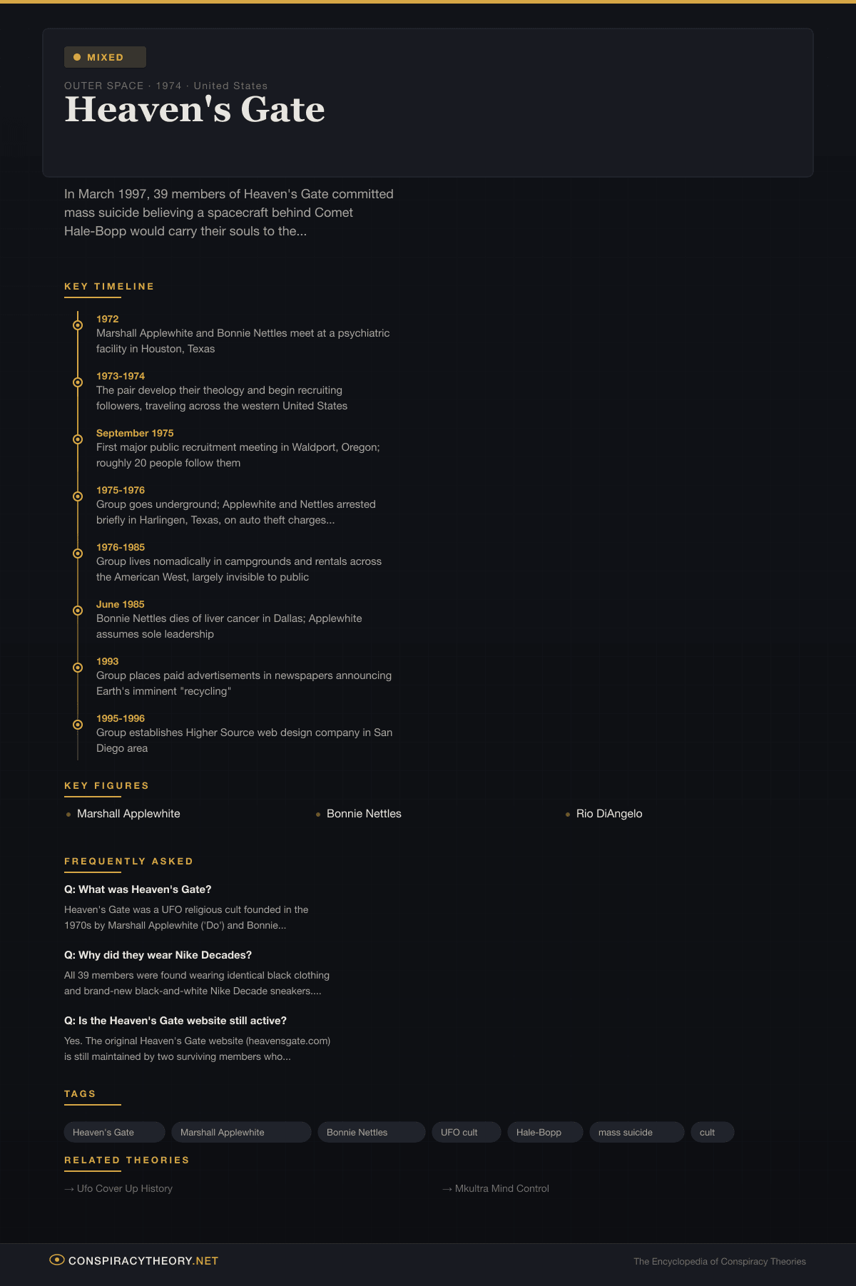 - UFO Cover-Up History — The broader history of alleged government suppression of UFO evidence, directly relevant to Heaven’s Gate’s cosmology