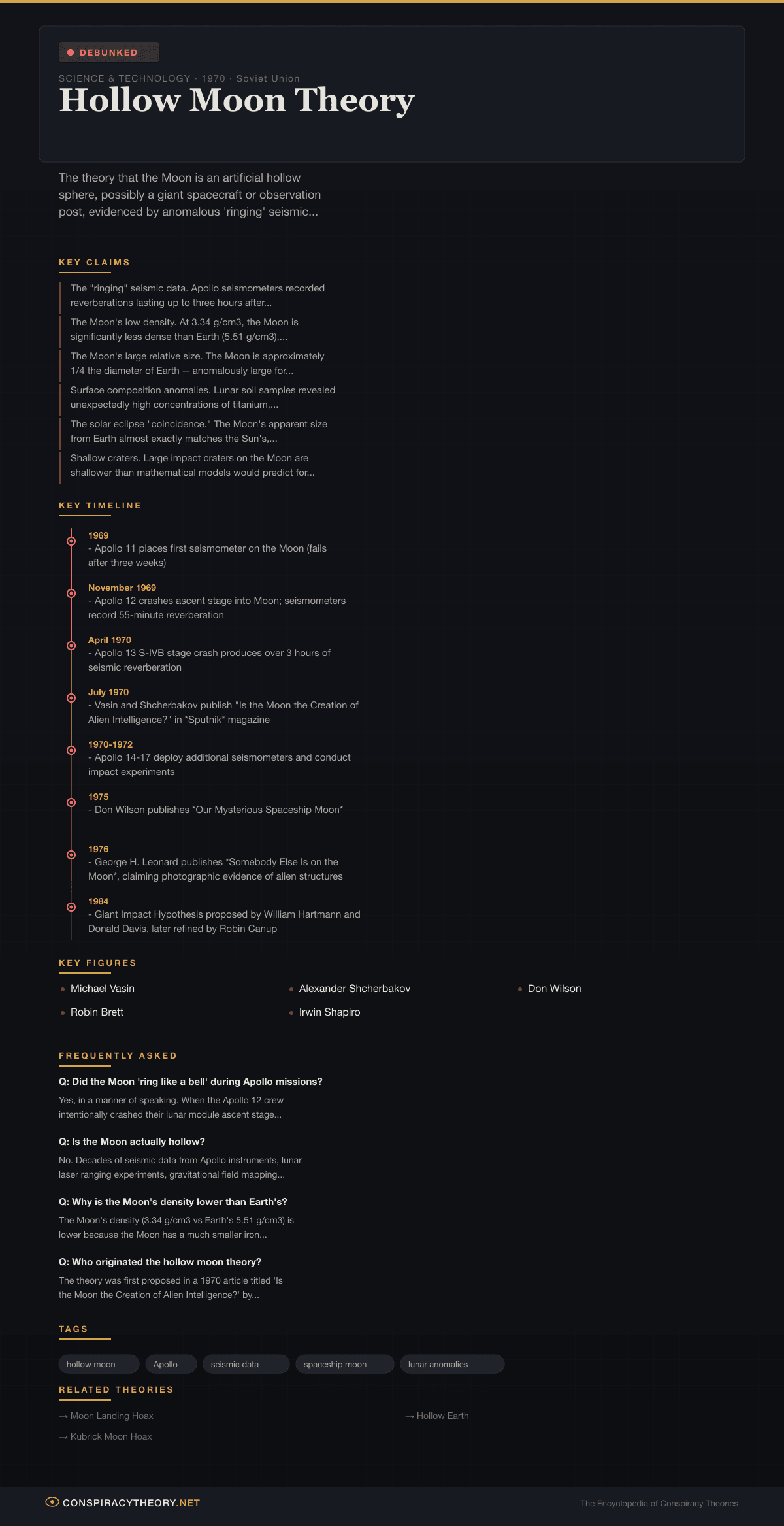In conspiracy theory taxonomy, the hollow moon sits at the far end of the unfalsifiability spectrum. Unlike theories about government cover-ups or corporate malfeasance, it makes a claim about the fundamental nature of a celestial body — a claim that has been tested and falsified by multiple independent methods. Its persistence despite conclusive contrary evidence makes it a pure article of faith, more akin to religious belief than to evidence-based skepticism.
