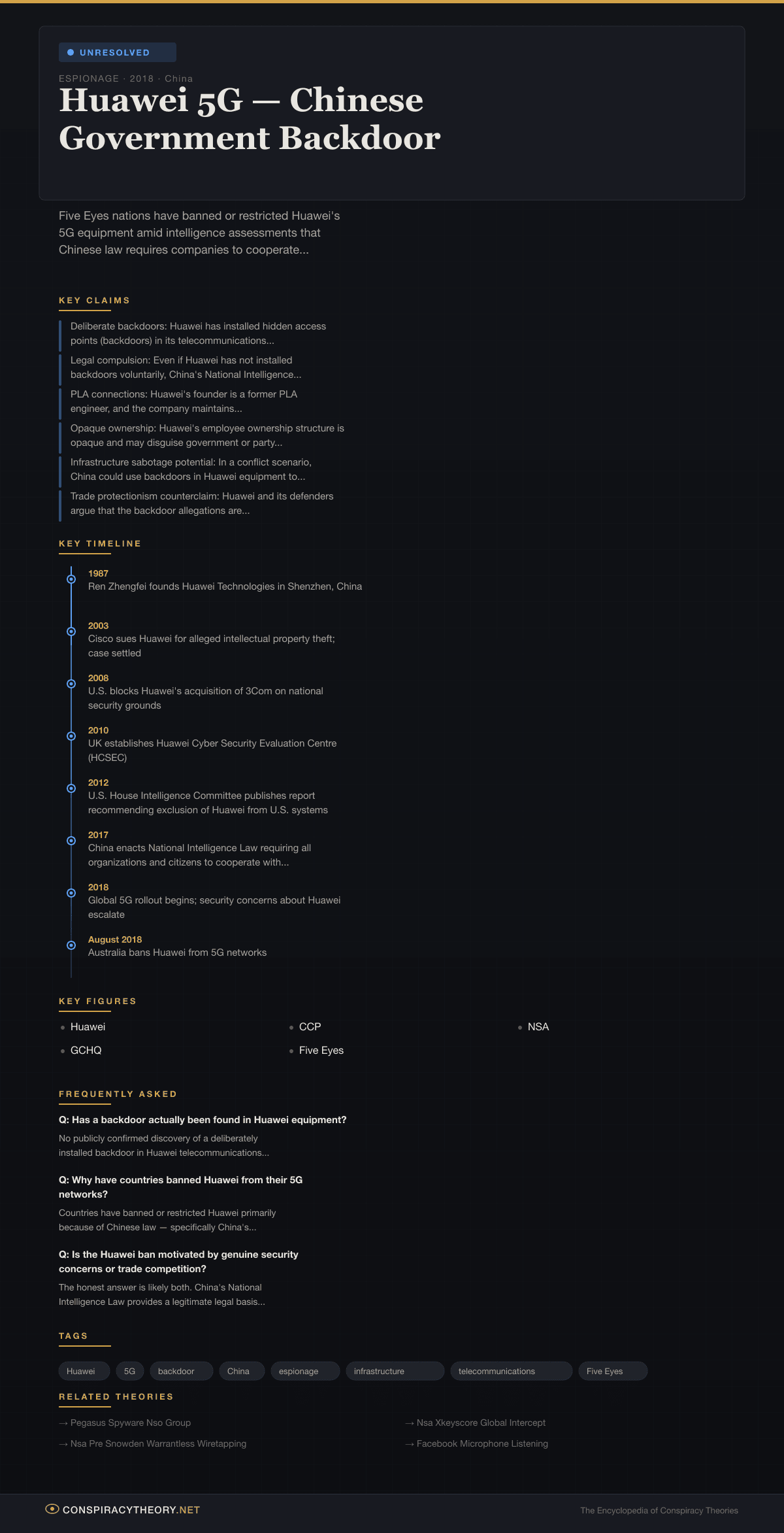 The theory that Chinese telecommunications giant Huawei has embedded backdoors in its 5G network equipment — enabling the Chinese government to conduct espionage, intercept communications, or disrupt critical infrastructure in foreign nations — has driven one of the most consequential geopolitical confrontations of the 21st century. Unlike most conspiracy theories, the Huawei backdoor question exists at the intersection of confirmed legal frameworks, documented cybersecurity vulnerabilities, classified intelligence assessments, and genuine geopolitical rivalry, making its classification unusually complex.