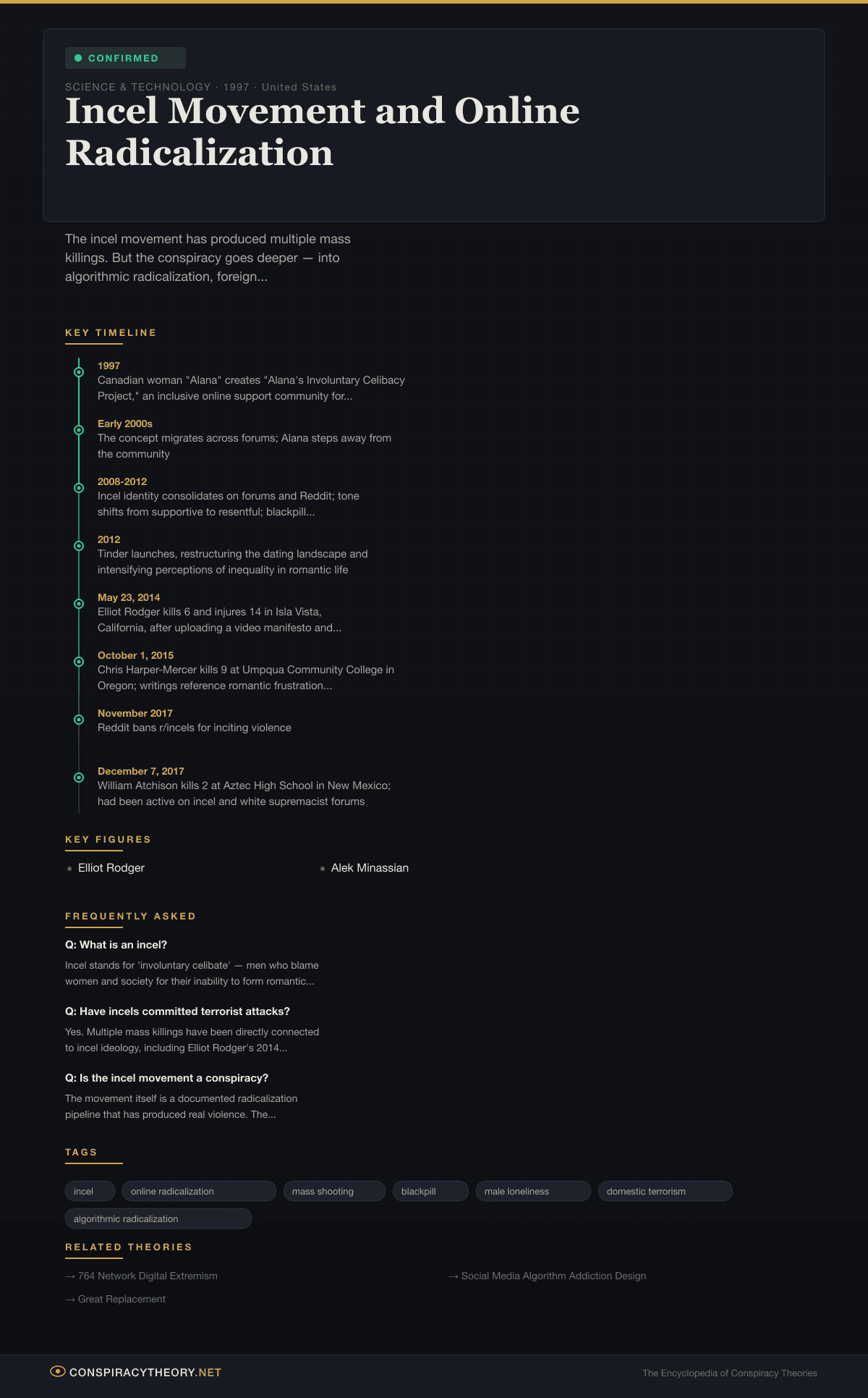The incel movement is classified as confirmed — not as a conspiracy theory in the speculative sense, but as a documented radicalization pipeline that has produced multiple acts of mass violence. The violence is real. The body count is real. The online infrastructure that turns lonely young men into potential terrorists is real. What remains genuinely conspiratorial is the question of amplification: whether hostile state actors, accelerationist networks, and algorithmically designed social media platforms are deliberately accelerating a process that might otherwise remain confined to bitter internet forums.