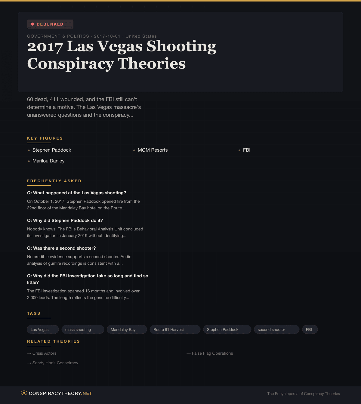 The Las Vegas shooting conspiracy theories are instructive because they emerge from a genuine gap in the official record. Unlike Sandy Hook or 9/11 conspiracy theories, which contradict extensive evidence, the Vegas theories grow from the absence of evidence — specifically, the absence of a motive.