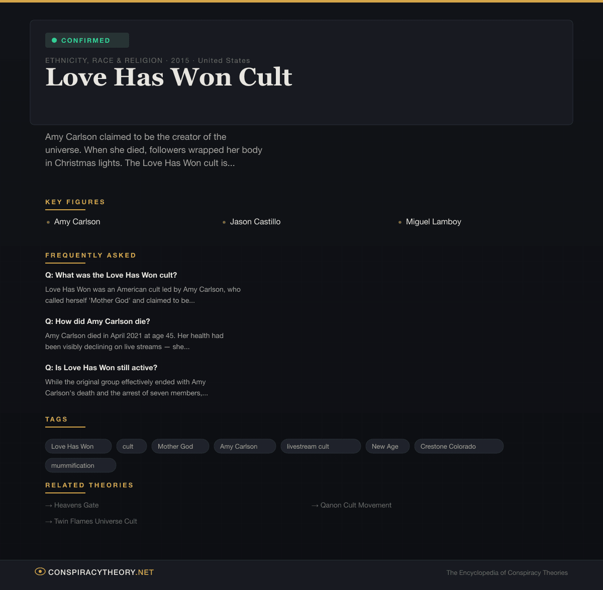 Love Has Won is classified as confirmed. The group’s cultic operations, the abuse of Amy Carlson’s corpse, the child abuse charges, and the legal proceedings against seven members are all matters of public record. What remains debated is the degree to which Carlson herself was victim or perpetrator — whether she was a manipulative leader or a mentally ill woman exploited by the people around her as her condition worsened.