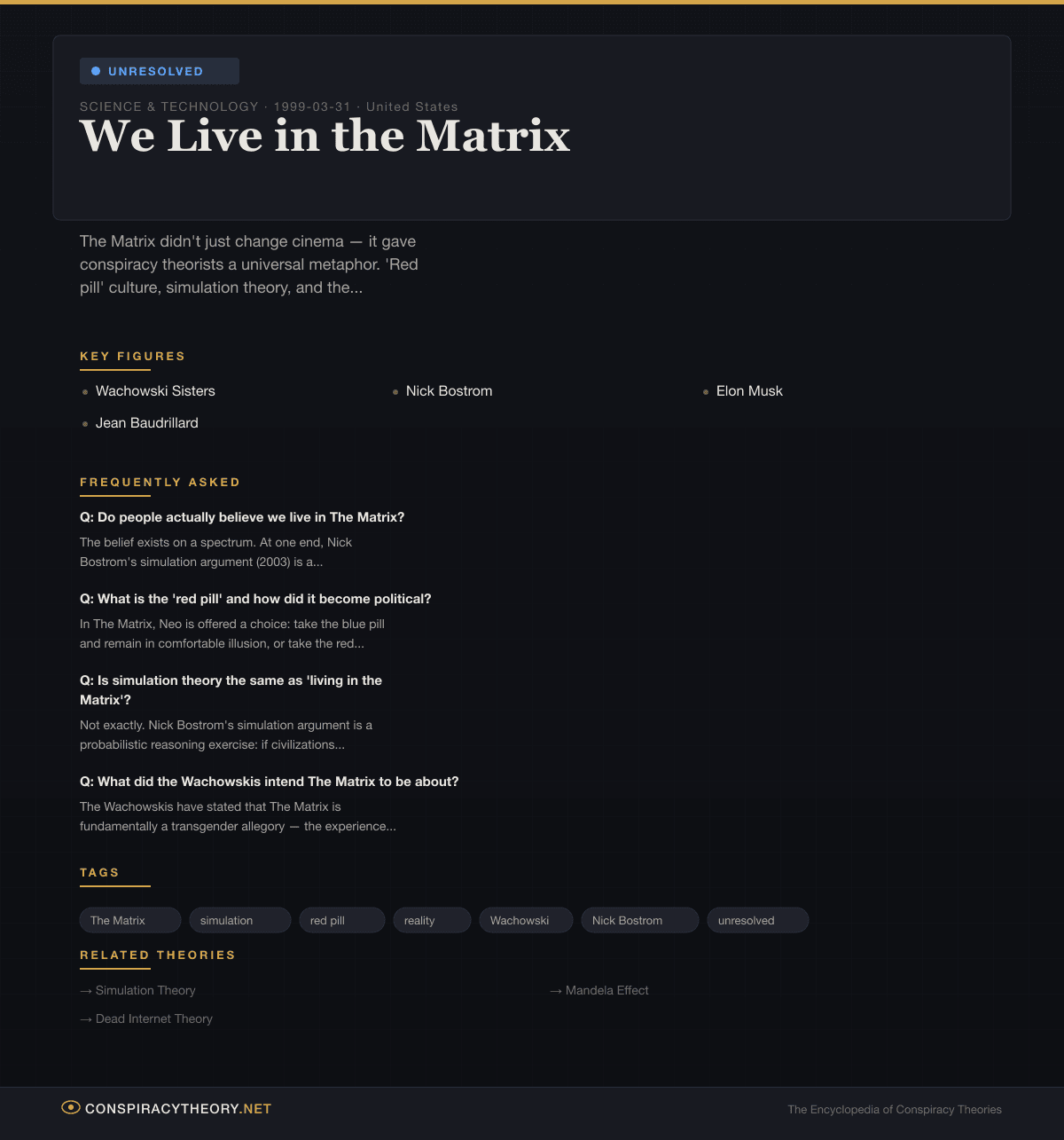 We Live in the Matrix — Conspiracy Theory Timeline 1999-03-31, United States