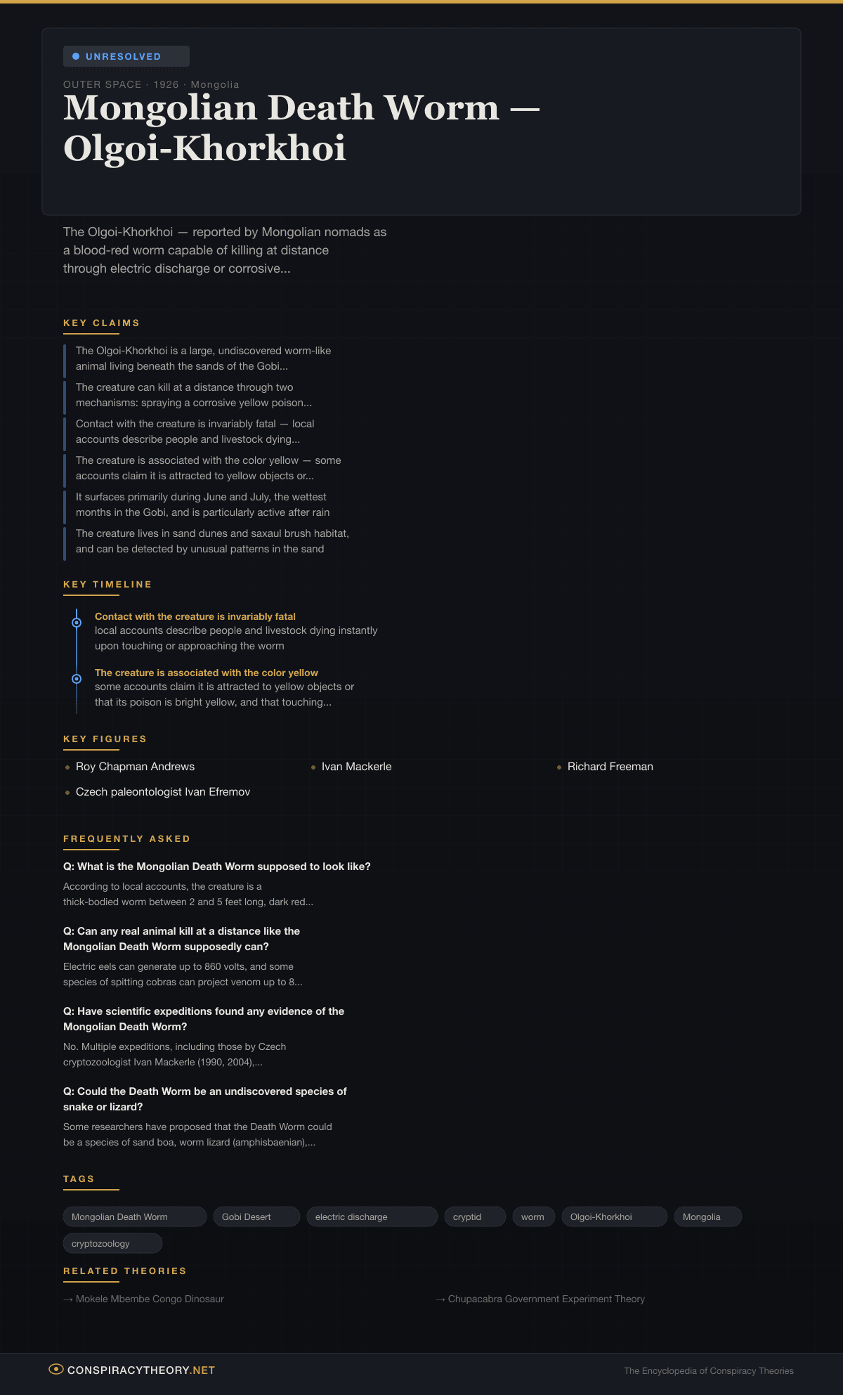 Mongolian Death Worm — Olgoi-Khorkhoi — visual timeline and key facts infographic