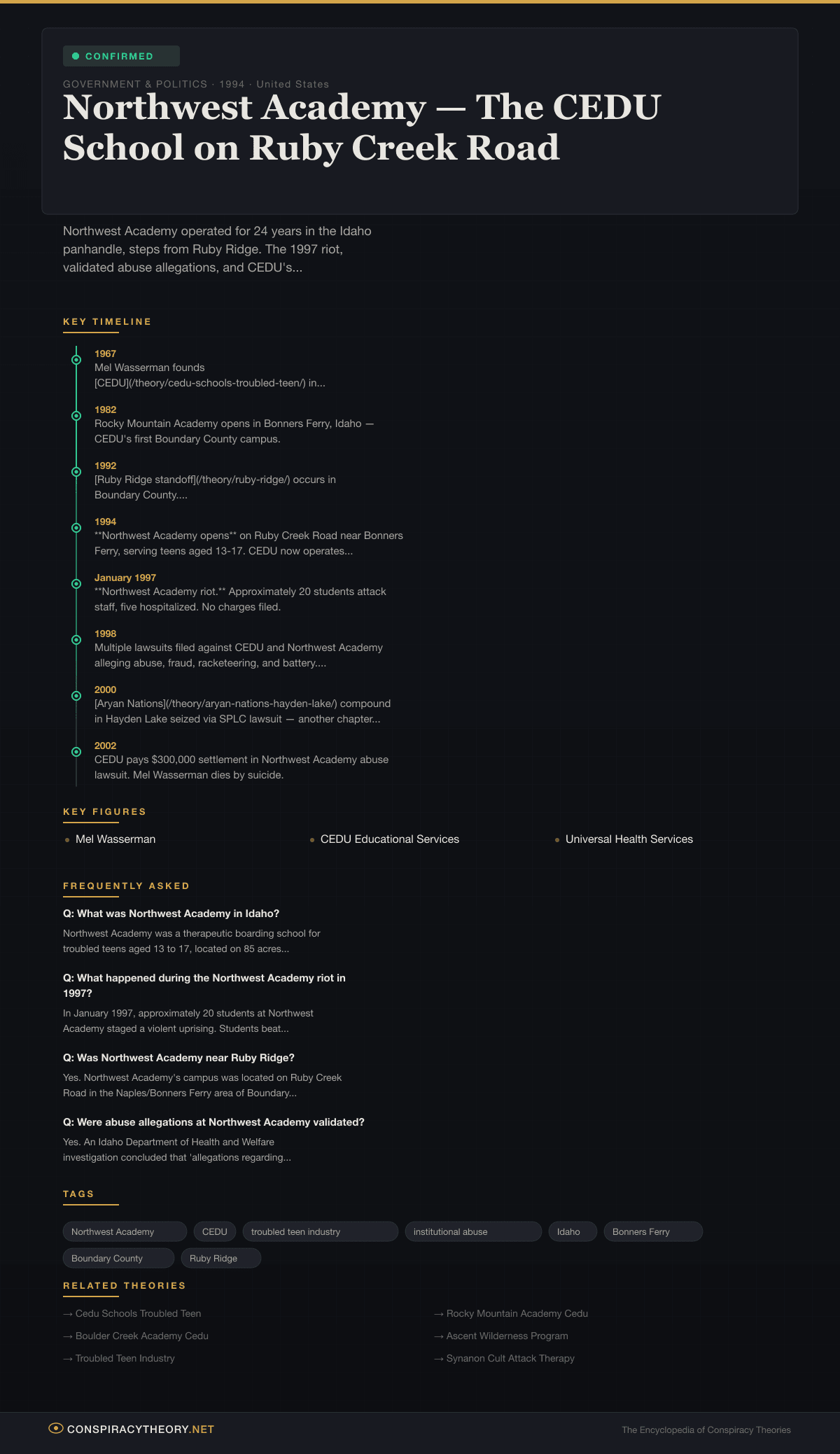 - Ruby Ridge — the 1992 federal standoff that occurred in the same Boundary County neighborhood where CEDU built its empire.