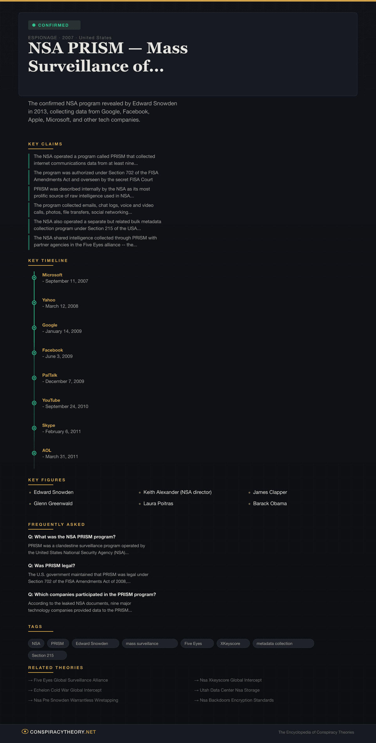 PRISM is classified as confirmed — it is a documented government surveillance program whose existence was acknowledged by the U.S. government, verified by multiple independent journalistic investigations, and subsequently debated in Congress and the courts. However, significant disputes remain about the precise technical mechanisms of data collection, the degree of corporate complicity, and the scope of incidental collection of Americans’ communications.