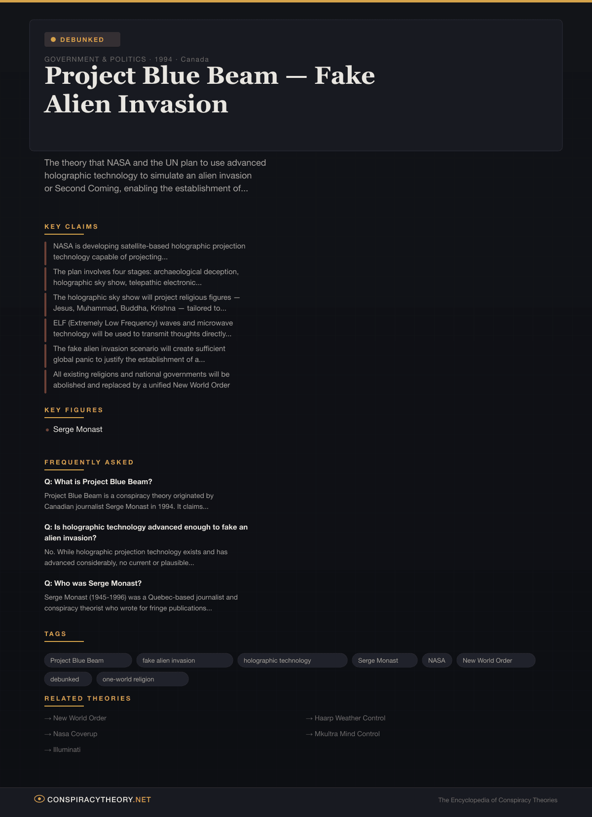 Project Blue Beam is entirely unsupported by credible evidence. The theory rests on a single source — Serge Monast’s self-published 1994 document — which provides no verifiable references, no documentary evidence, no named whistleblowers, and no technical specifications for the claimed technology.