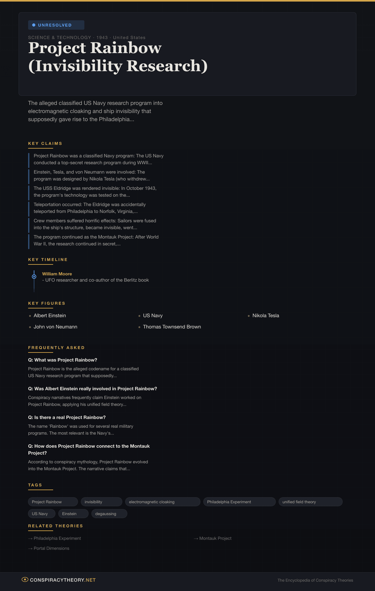 - Philadelphia Experiment — the specific alleged experiment that Project Rainbow supposedly conducted on the USS Eldridge