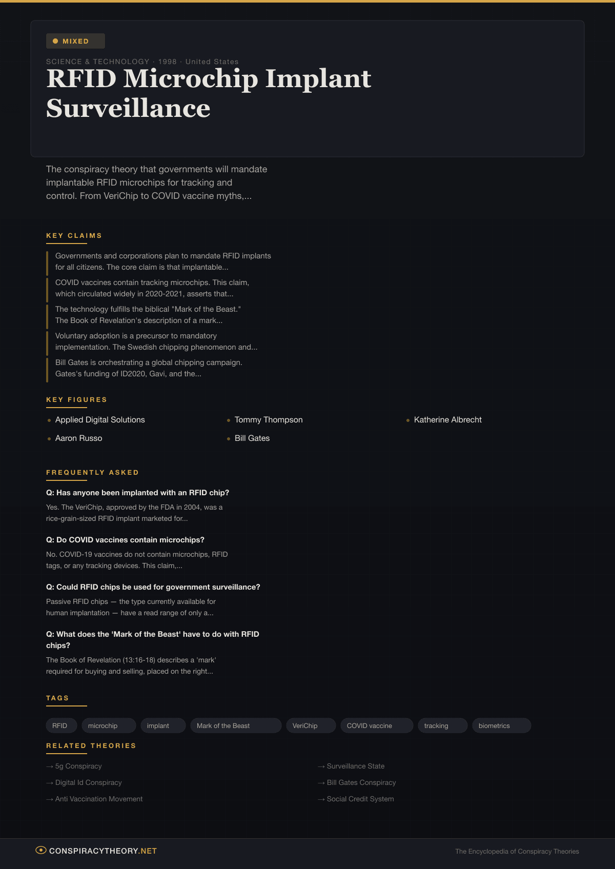 The RFID microchip conspiracy theory is one of the most resilient and adaptive conspiracy theories of the modern era. It has survived for over two decades by doing what successful conspiracy theories always do: attaching itself to whatever technology, policy, or crisis happens to be generating public anxiety at the moment. In the early 2000s, the fear was about implantable medical chips. In the 2010s, it migrated to concerns about smart cards and biometric passports. During COVID, it fused with anti-vaccine sentiment and became one of the most widely circulated claims on social media. The specific technology changes; the core fear — that powerful institutions will place something inside your body to track and control you — endures.