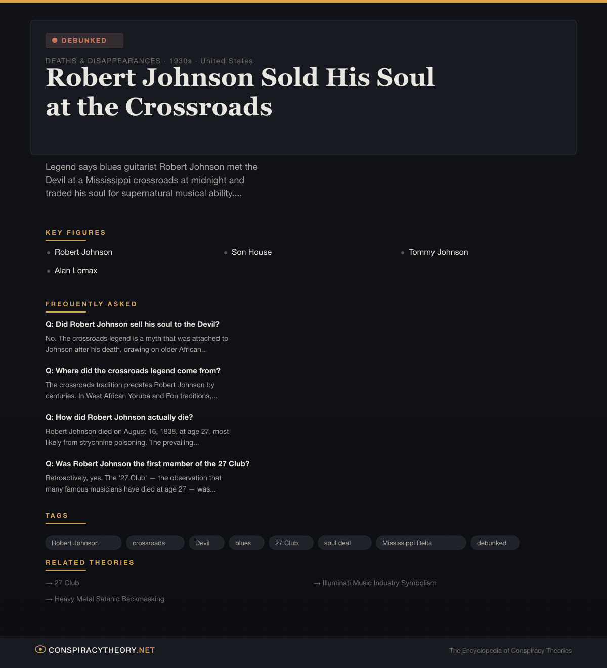 Johnson’s death at 27 retroactively made him the first member of the 27 Club — though the concept didn’t exist during his lifetime and wasn’t articulated until the cluster of rock star deaths in 1969-1971 (Brian Jones, Jimi Hendrix, Janis Joplin, Jim Morrison).