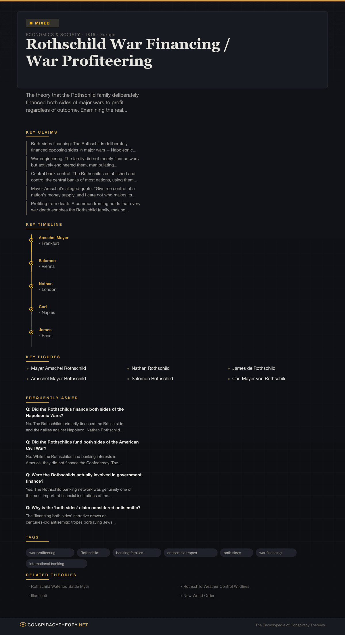 In short: the Rothschilds did profit from war financing (confirmed), but they did not secretly orchestrate wars or finance both sides as part of a coordinated conspiracy (debunked). The theory lands at mixed because the factual foundation is real, even though the conspiracy superstructure built on top of it is not.