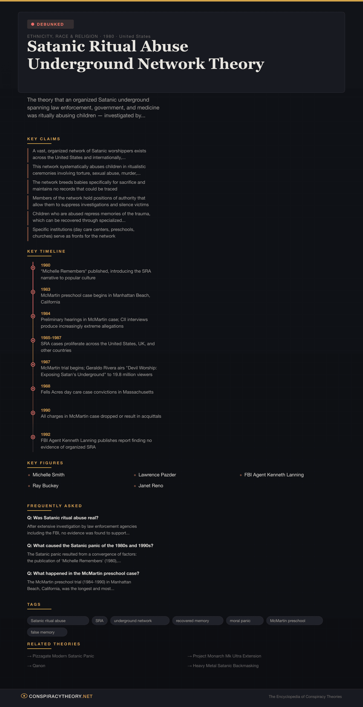 Satanic Ritual Abuse Underground Network Theory — visual timeline and key facts infographic