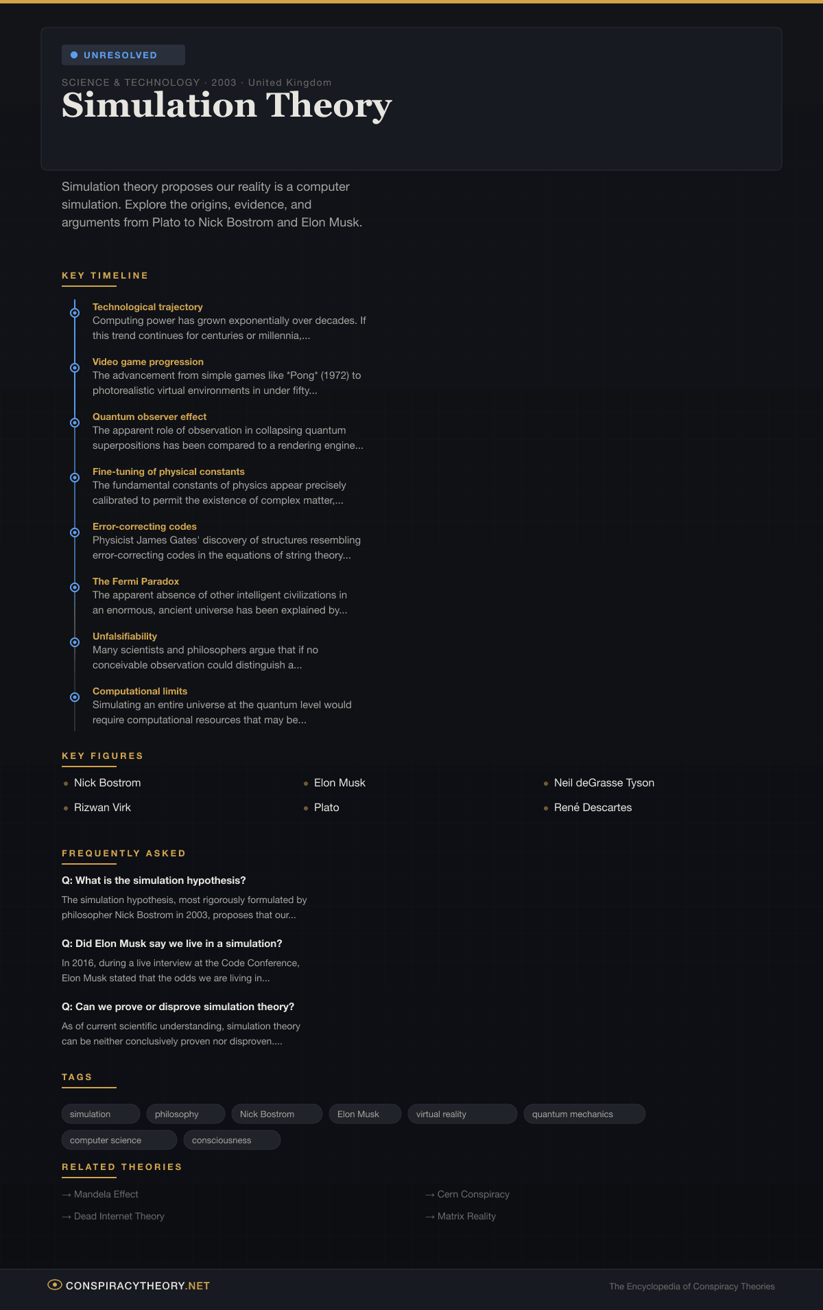 Simulation theory — also known as the simulation hypothesis or simulation argument — is the philosophical proposition that the reality experienced by conscious beings, including all of human civilization and the observable universe, could be an artificial simulation generated by a vastly more advanced civilization’s computing technology. While the idea has deep roots in the history of philosophy, its modern formulation was established by Swedish philosopher Nick Bostrom in his 2003 paper “Are You Living in a Computer Simulation?” published in Philosophical Quarterly.