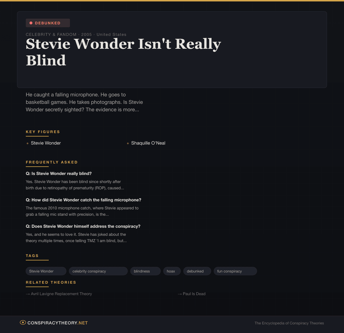 The Stevie Wonder blindness theory belongs to the broader family of celebrity replacement and deception conspiracies that question whether public figures are who they claim to be. It shares DNA with the Paul Is Dead theory and the Avril Lavigne replacement theory, though it’s notably more lighthearted than either. Unlike theories involving celebrity cloning or celebrity sacrifice, the Stevie Wonder theory carries no sinister implications — it’s pure entertainment, and everyone involved, including Stevie himself, seems to know it.
