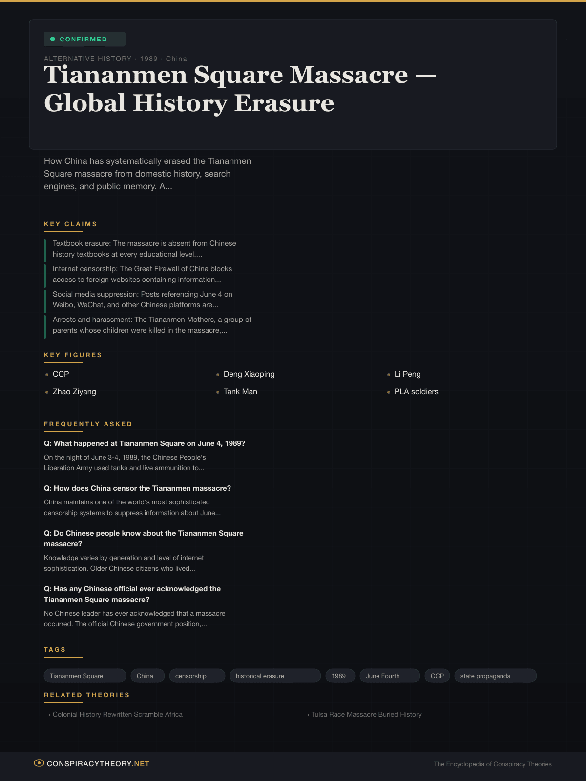 The Chinese Communist Party’s erasure of the Tiananmen Square massacre is not a conspiracy theory in the conventional sense — it is a confirmed, ongoing, state-sponsored campaign of historical suppression, documented by journalists, human rights organizations, and the Chinese government’s own censorship apparatus. What makes it relevant to this encyclopedia is not the question of whether the erasure is happening (it demonstrably is) but the sheer scale and sophistication of the operation, and the uncomfortable questions it raises about how effectively a modern state can rewrite history.