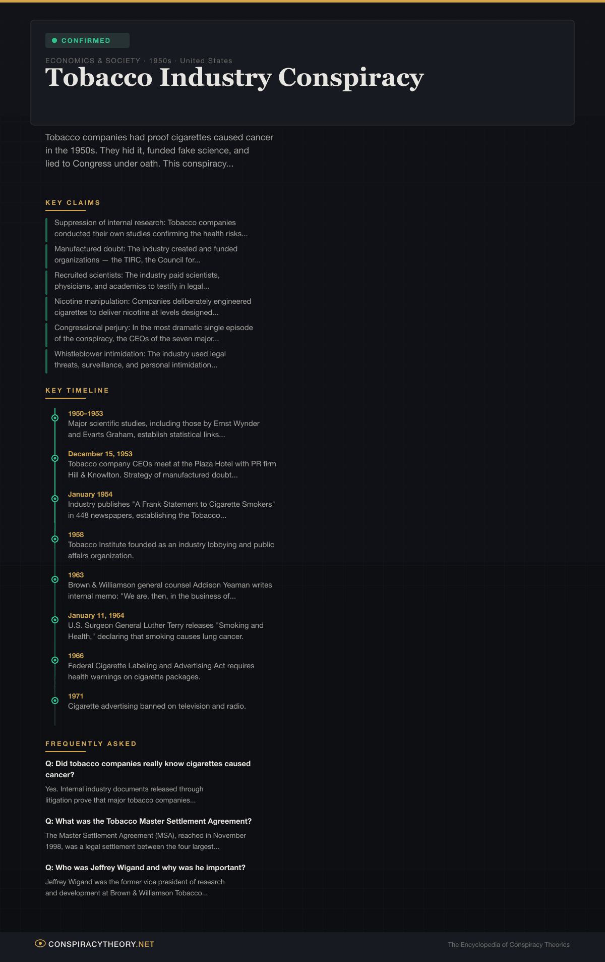 Tobacco Industry Conspiracy — Conspiracy Theory Timeline 1950s, United States