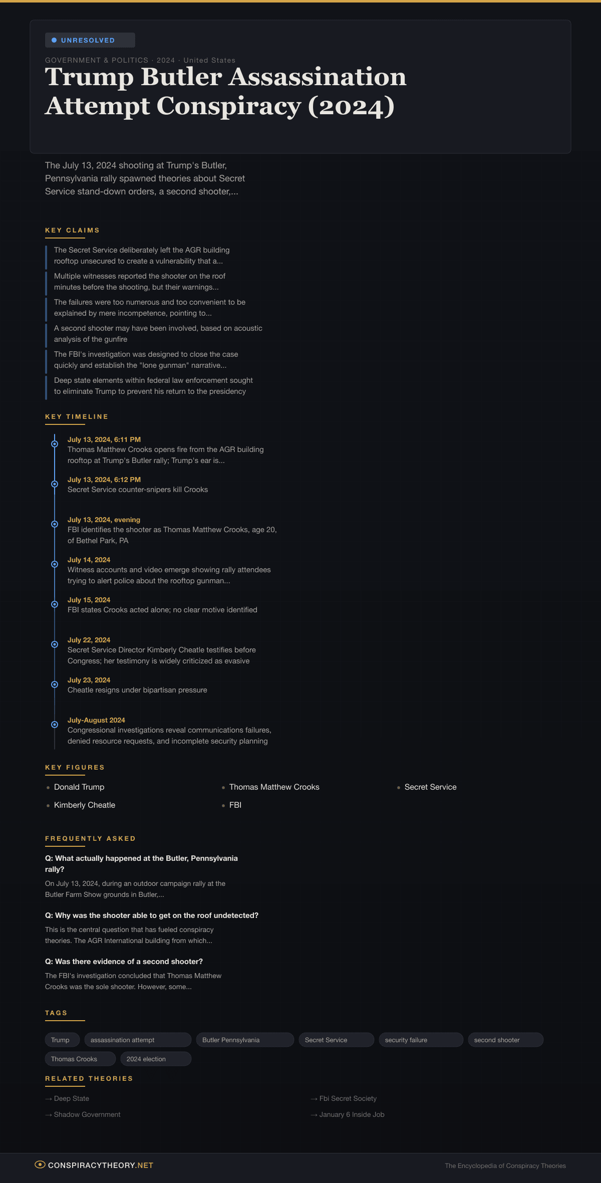 Trump Butler Assassination Attempt Conspiracy (2024) — visual timeline and key facts infographic