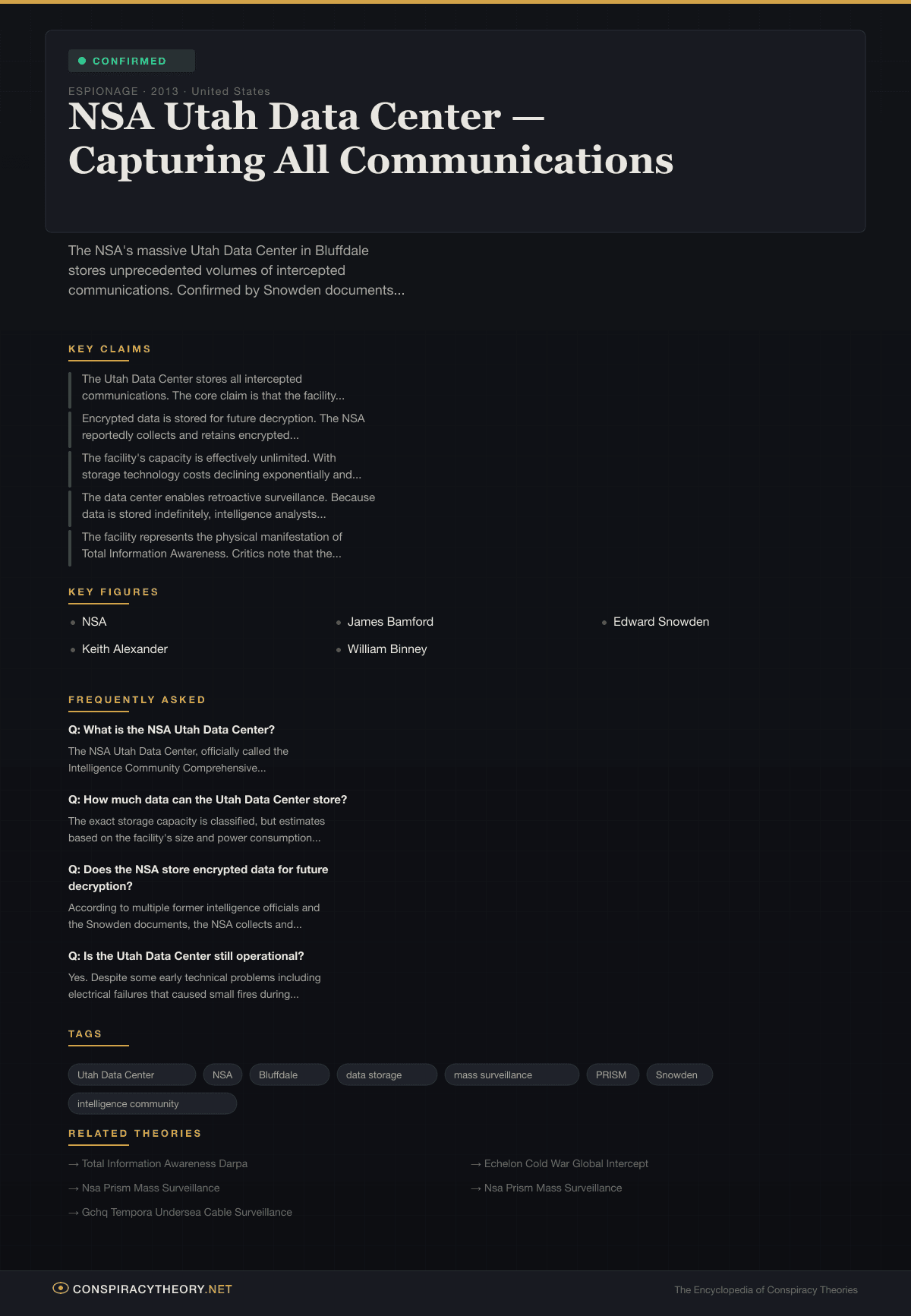 This theory is classified as confirmed. The facility’s existence, its purpose as an intelligence data repository, and the NSA’s bulk collection practices that fill it have all been officially acknowledged or documented through classified materials made public.