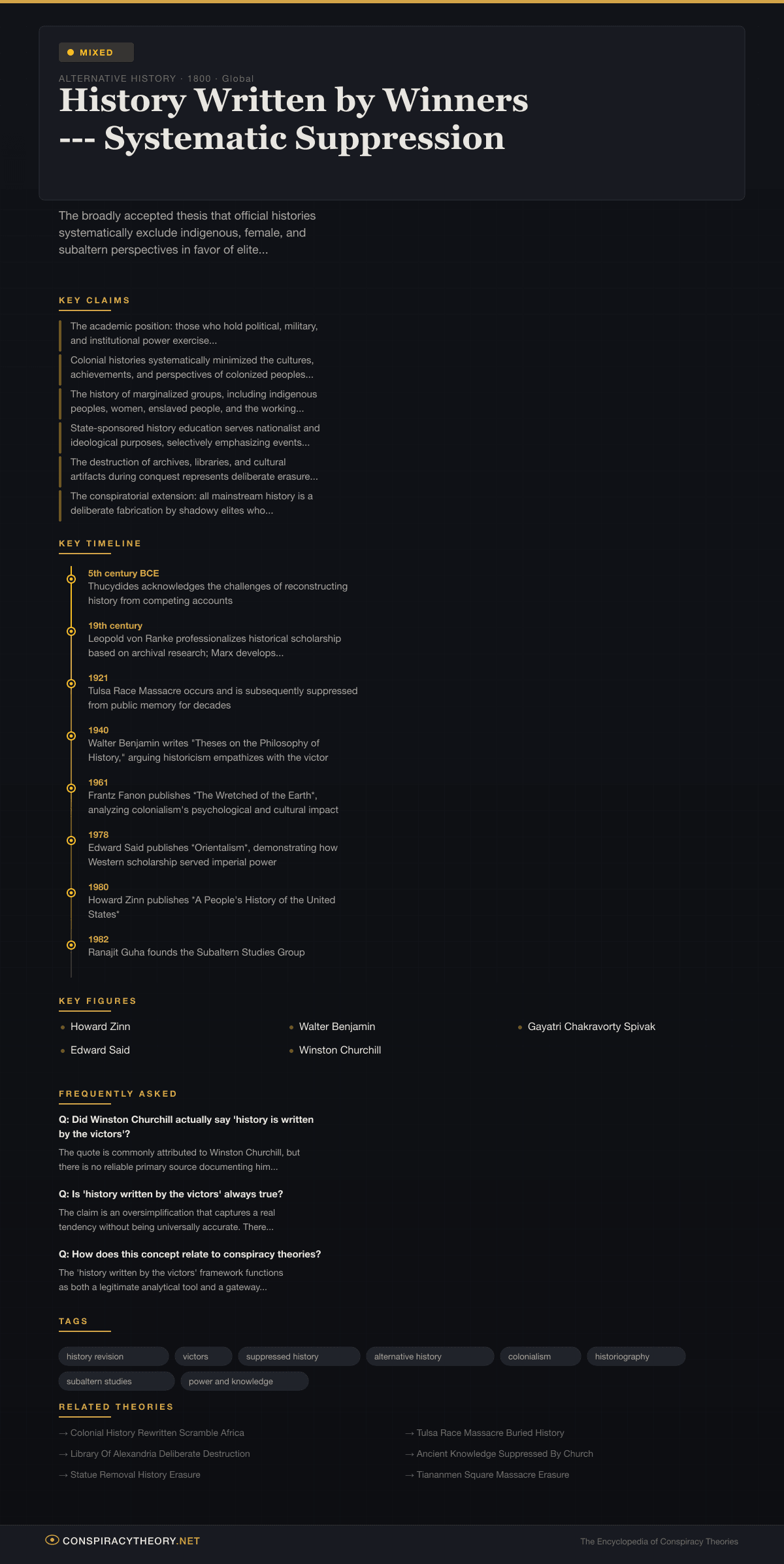- 2020s — Social media amplifies both legitimate historical recovery projects and conspiratorial applications of the “victors write history” framework