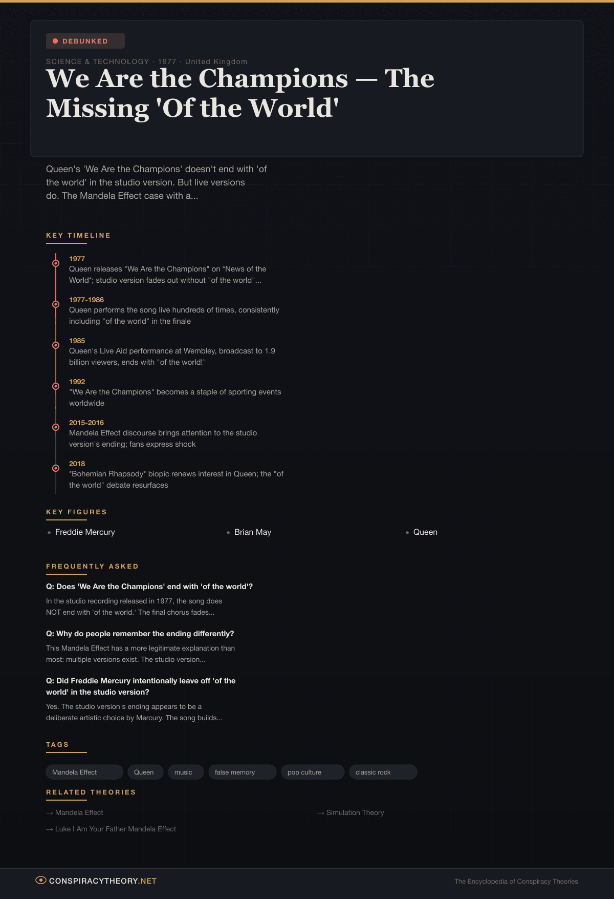 Within Mandela Effect communities, “We Are the Champions” is frequently cited alongside the Berenstain Bears and the Monopoly Man’s monocle as evidence of timeline shifts or reality glitches. The argument goes: in the “original” timeline, the studio version ended with “of the world,” and the change is evidence of a simulation patch or a universe merge.
