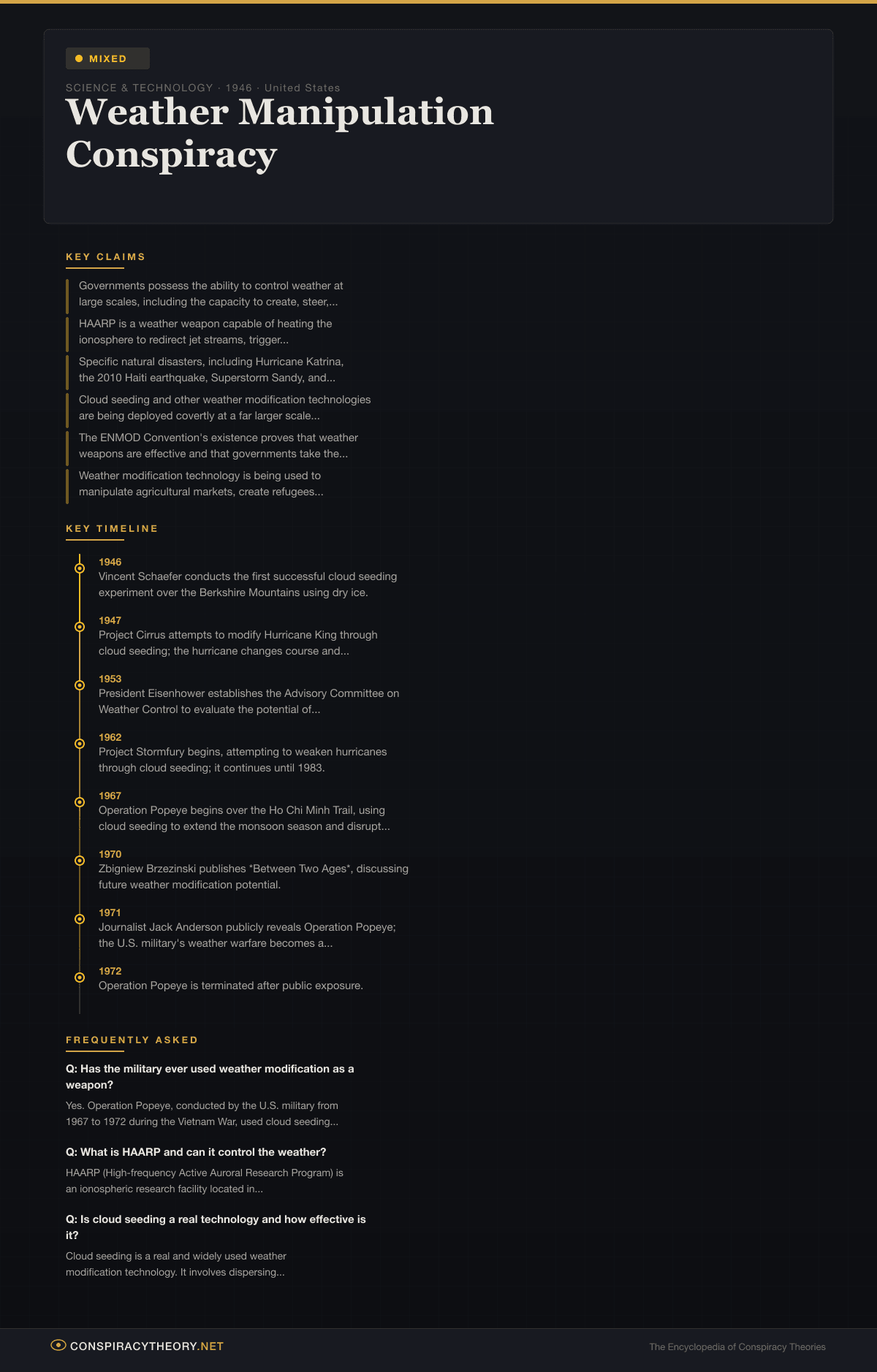 Weather Manipulation Conspiracy — visual timeline and key facts infographic