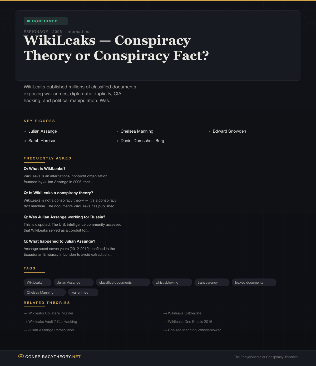 WikiLeaks is not a conspiracy theory — it's a conspiracy fact machine. The documents WikiLeaks has published have confirmed numerous actual conspiracies: the U.S. military's cover-up of civilian killings in Iraq and Afghanistan, the CIA's development of hacking tools to penetrate consumer electronics, diplomatic duplicity between allied nations, and corporate espionage by private intelligence firms. However, conspiracy theories have grown around WikiLeaks itself — particularly regarding Assange's relationship with Russian intelligence and the motivations behind the timing of certain releases.