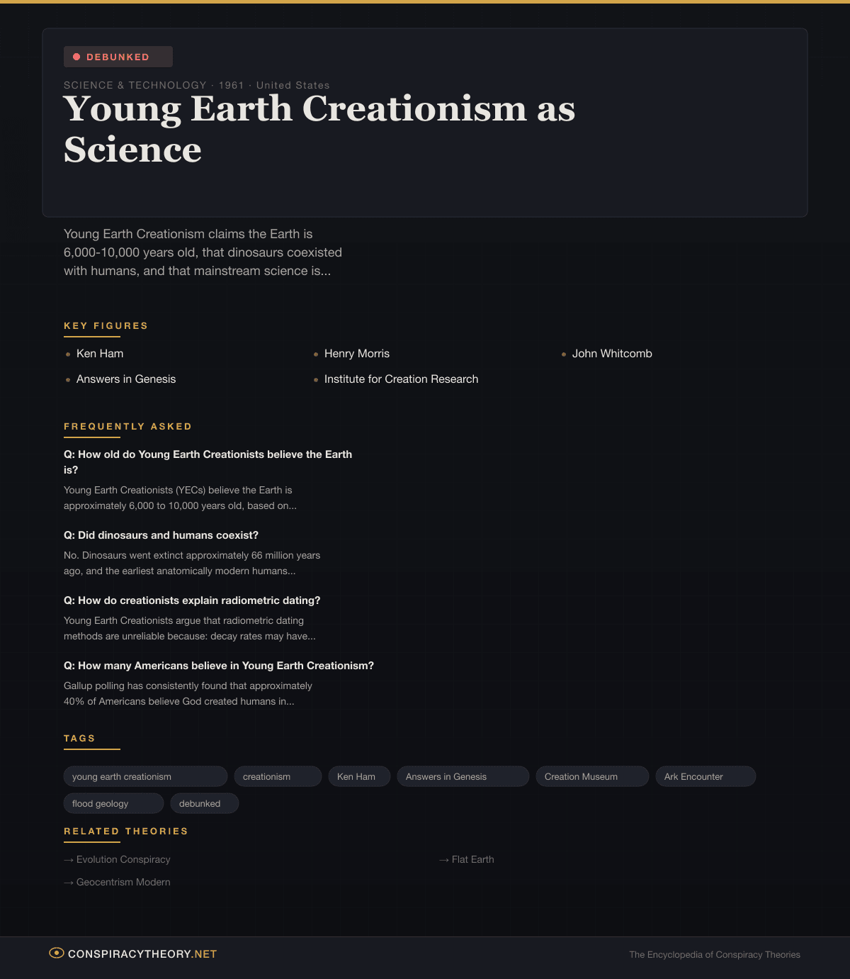 It is, by any scientific standard, comprehensively debunked. The Earth is 4.54 billion years old. The universe is 13.8 billion years old. Evolution is supported by evidence from genetics, paleontology, comparative anatomy, and direct observation. These are not opinions. They are measurements.