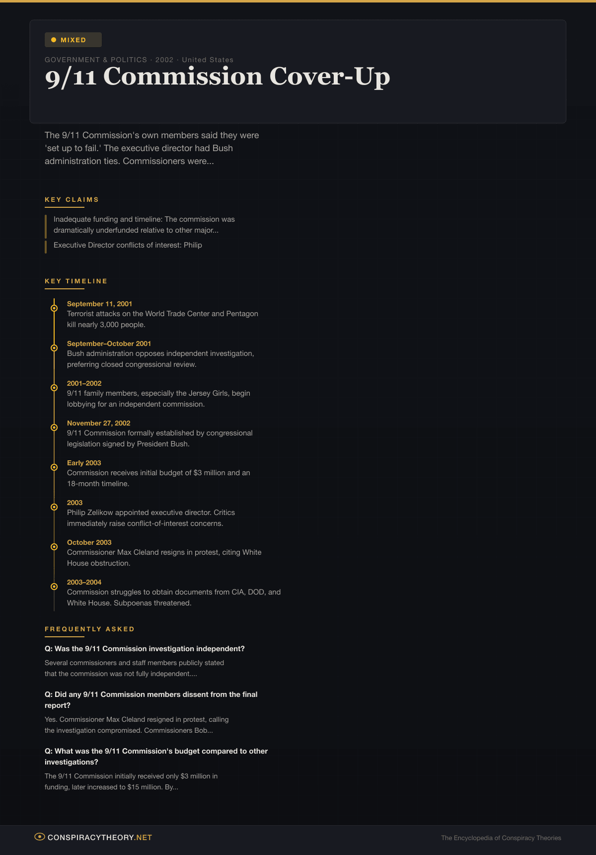 What is confirmed: The commission was underfunded, particularly in its early phases. Zelikow had documented conflicts of interest. Commissioners publicly stated they faced access restrictions. The NORAD timeline provided in earlier testimony was inaccurate. Bush and Cheney testified under restrictive conditions. Multiple commissioners expressed dissatisfaction.