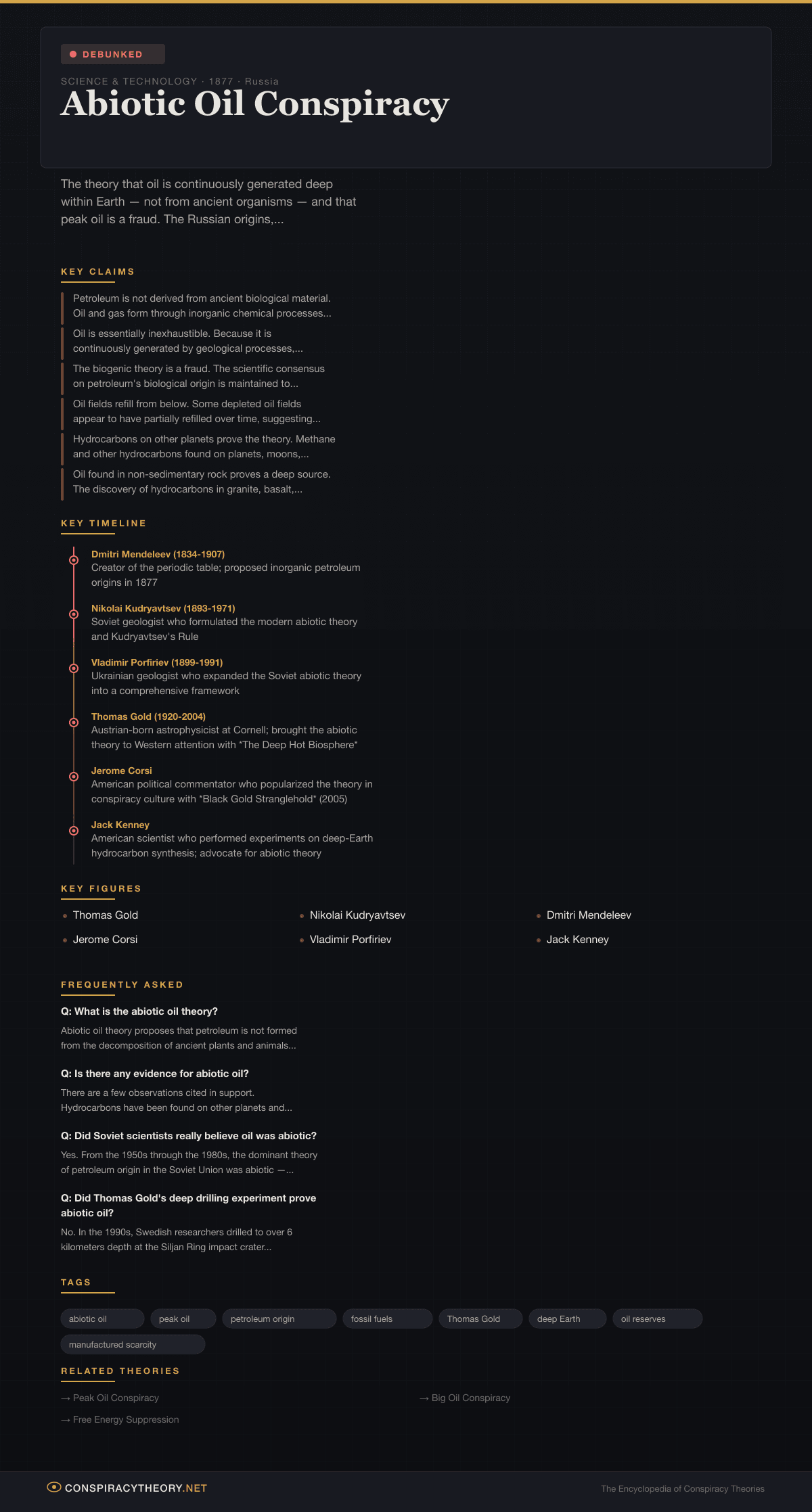 The abiotic oil theory occupies a distinctive niche at the intersection of science, politics, and conspiracy culture. In Russia, it represents a chapter in the history of Soviet science — an era when ideological independence from Western scientific frameworks was considered a virtue, and when genuinely talented scientists developed alternative paradigms that proved less durable than their Western counterparts.