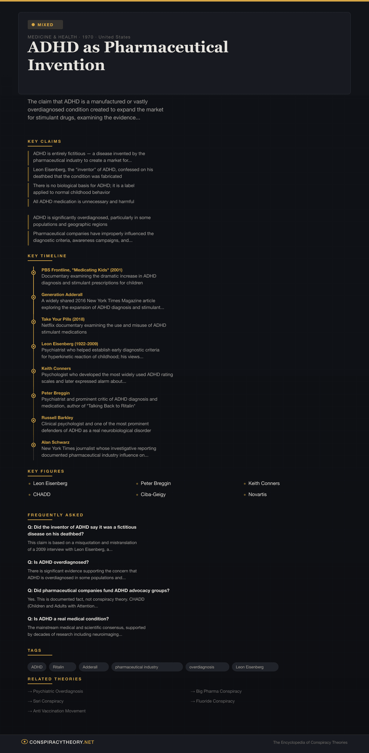 At the same time, the strongest version of the theory — that ADHD is entirely fictional, a disease invented from whole cloth to create a market for drugs — is contradicted by substantial scientific evidence including neuroimaging studies, genetic research, and decades of clinical data. The theory is classified as “mixed” because it contains elements that are confirmed (pharmaceutical industry influence on diagnosis and advocacy), elements that are debunked (the claim that ADHD is wholly fictitious), and elements that remain genuinely debated within mainstream medicine (the extent of overdiagnosis, the appropriate threshold for medication).