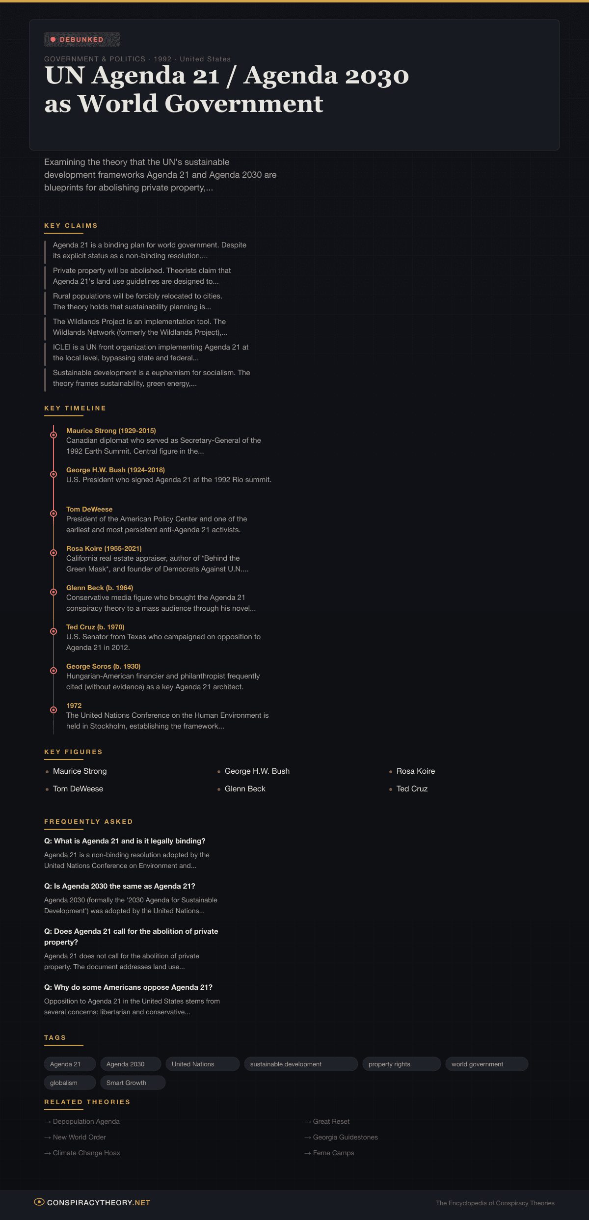 The theory that the United Nations’ Agenda 21 — and its successor framework, Agenda 2030 — constitutes a blueprint for abolishing private property, forcibly relocating populations from rural to urban areas, and establishing a socialist world government under UN control has been one of the most politically influential conspiracy theories in the United States since the mid-2000s. Unlike many conspiracy theories that remain on the cultural margins, the Agenda 21 conspiracy theory has directly influenced American electoral politics, legislative action, and policy debates at the local, state, and national levels.