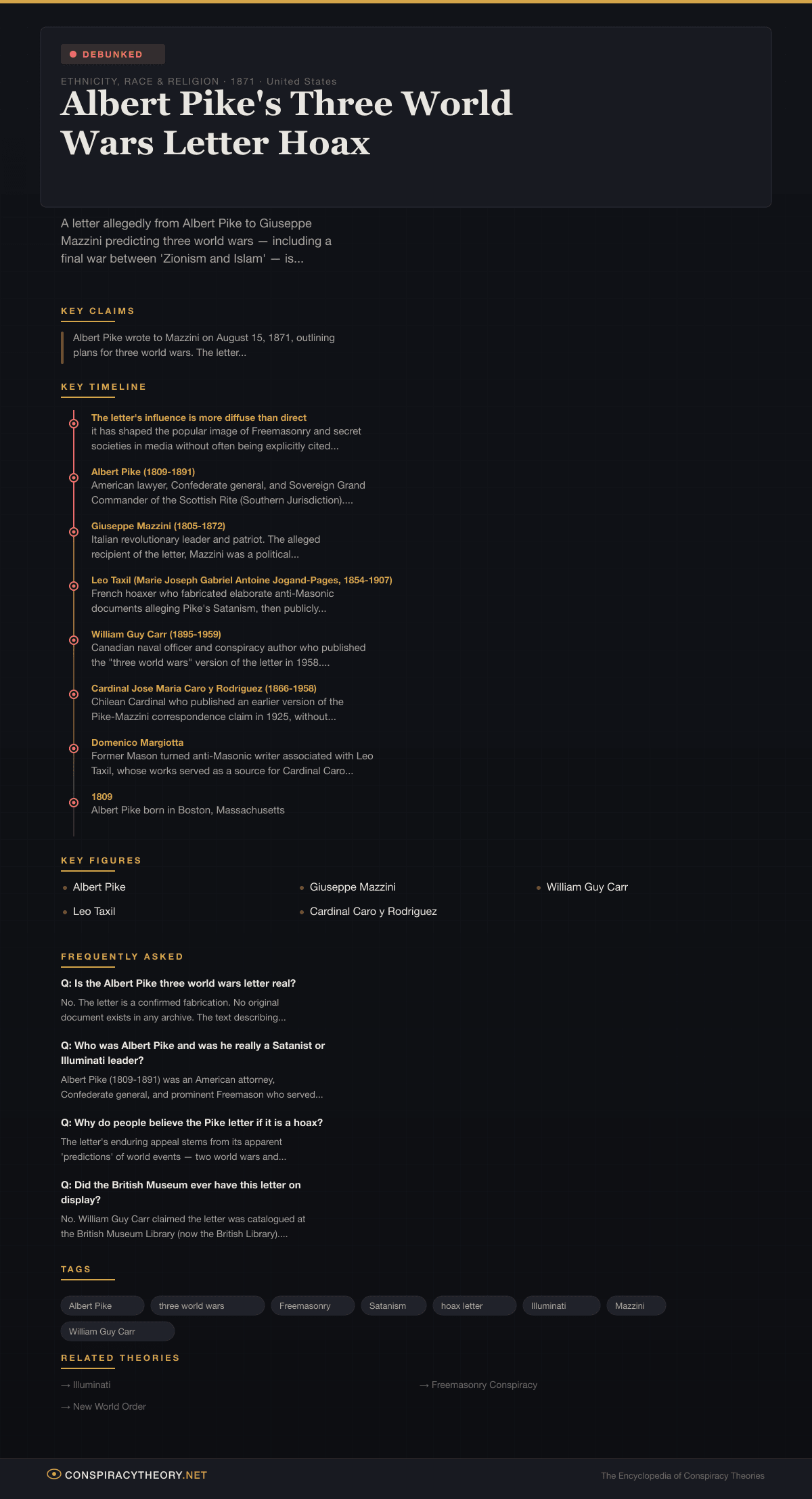 Among the most widely circulated conspiracy documents on the internet is an alleged letter written on August 15, 1871, by Albert Pike — a prominent American Freemason, Confederate general, and author of the Masonic philosophical treatise Morals and Dogma — to Giuseppe Mazzini, the Italian revolutionary leader. The letter supposedly outlines a plan for three world wars designed to bring about a New World Order under Luciferian control.