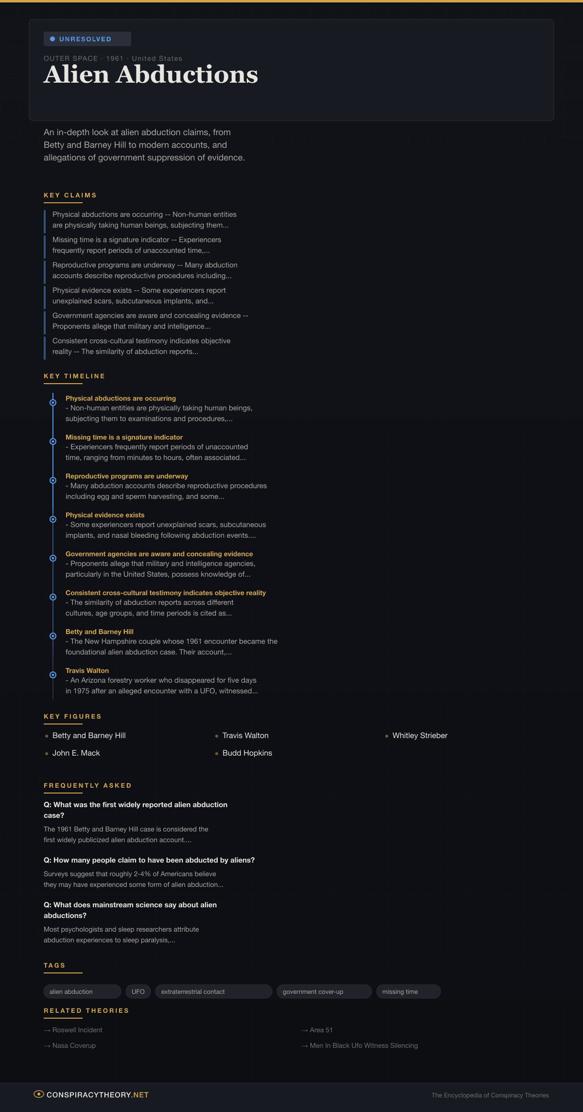 Alien abduction claims constitute one of the most enduring and culturally significant categories within UFO and extraterrestrial conspiracy discourse. The phenomenon involves individuals reporting that they have been taken against their will by non-human entities, subjected to physical and psychological examinations aboard craft of apparent extraterrestrial origin, and returned with partial or fully suppressed memories of the experience. These accounts have been reported across dozens of countries, though the overwhelming majority originate in the United States, and they share a remarkably consistent set of narrative elements: missing time, paralysis, bright lights, medical procedures, and encounters with beings described as humanoid with large eyes and grey skin.